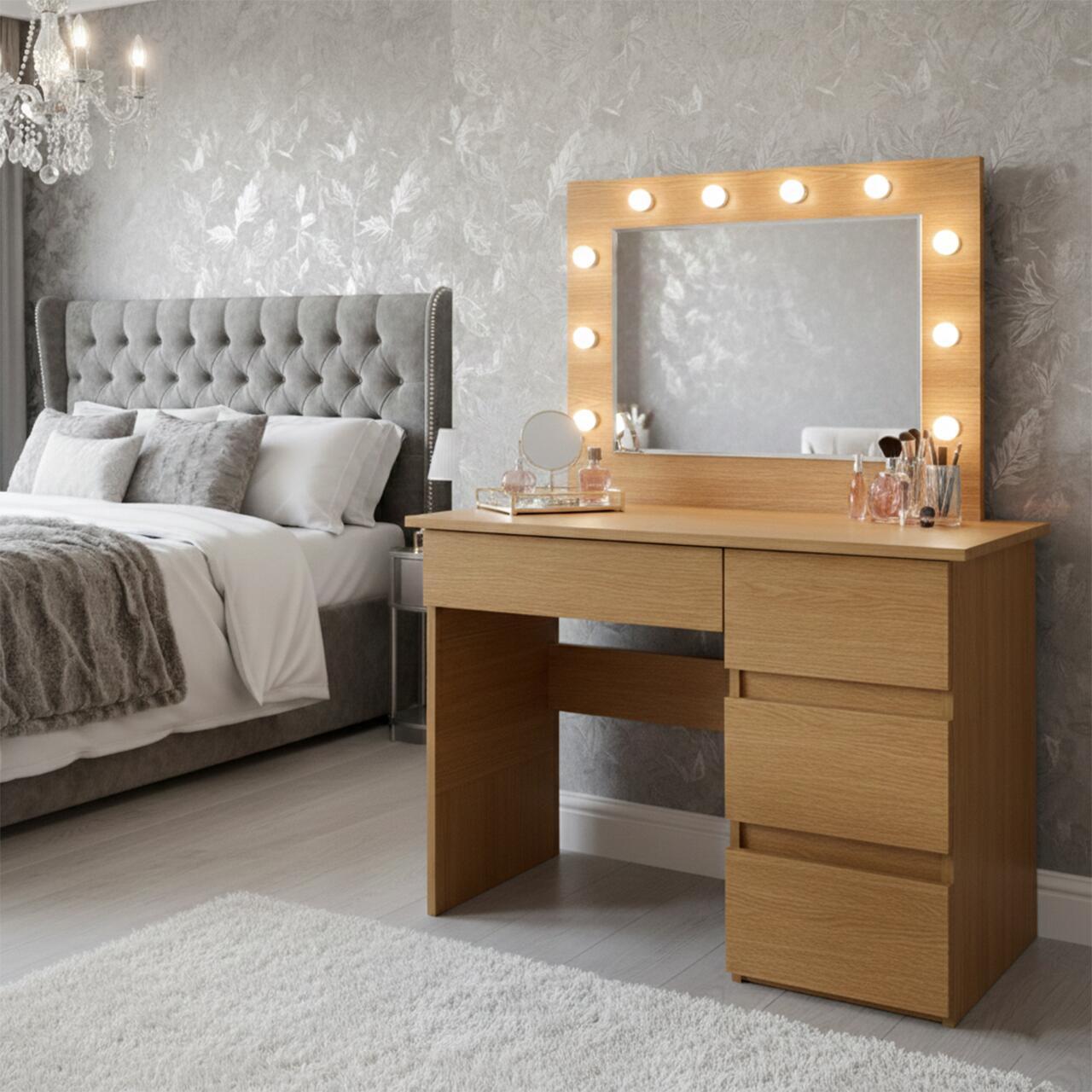 Design modern si finisaj Stejar: Cu un aspect natural si elegant, aceasta masa de machiaj se potriveste cu diverse stiluri de decor – de la minimalist la contemporan sau clasic modern.