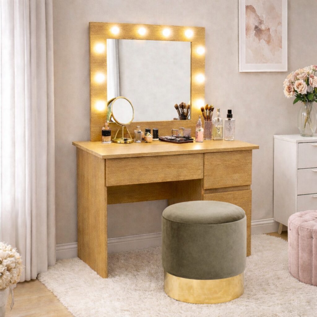 Design modern si finisaj Stejar: Cu un aspect natural si elegant, aceasta masa de machiaj se potriveste cu diverse stiluri de decor – de la minimalist la contemporan sau clasic modern.
