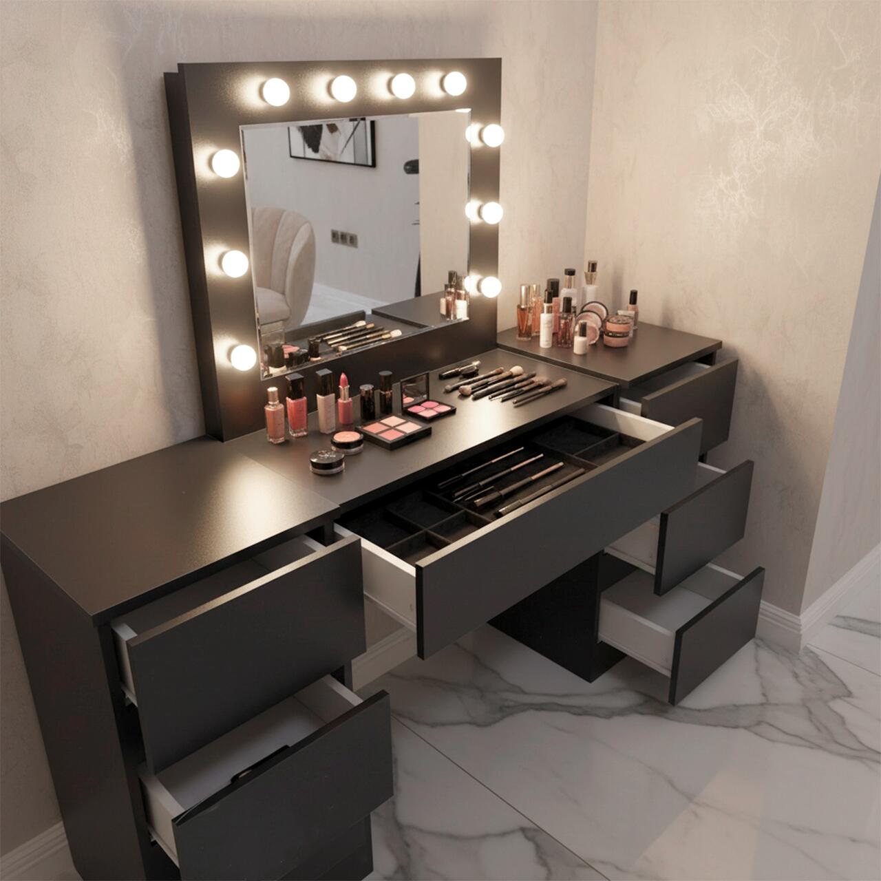 - Este o piesa de mobilier eleganta si practica, proiectata pentru a satisface nevoile si preferintele persoanelor care cauta un spatiu dedicat pentru a-si ingriji frumusetea si a-si stoca cosmeticele si bijuteriile. Aceasta masa este prevazuta cu o oglinda mare si 12 lumini LED incorporate, ceea ce o face ideala pentru aplicarea machiajului sau coafurii.