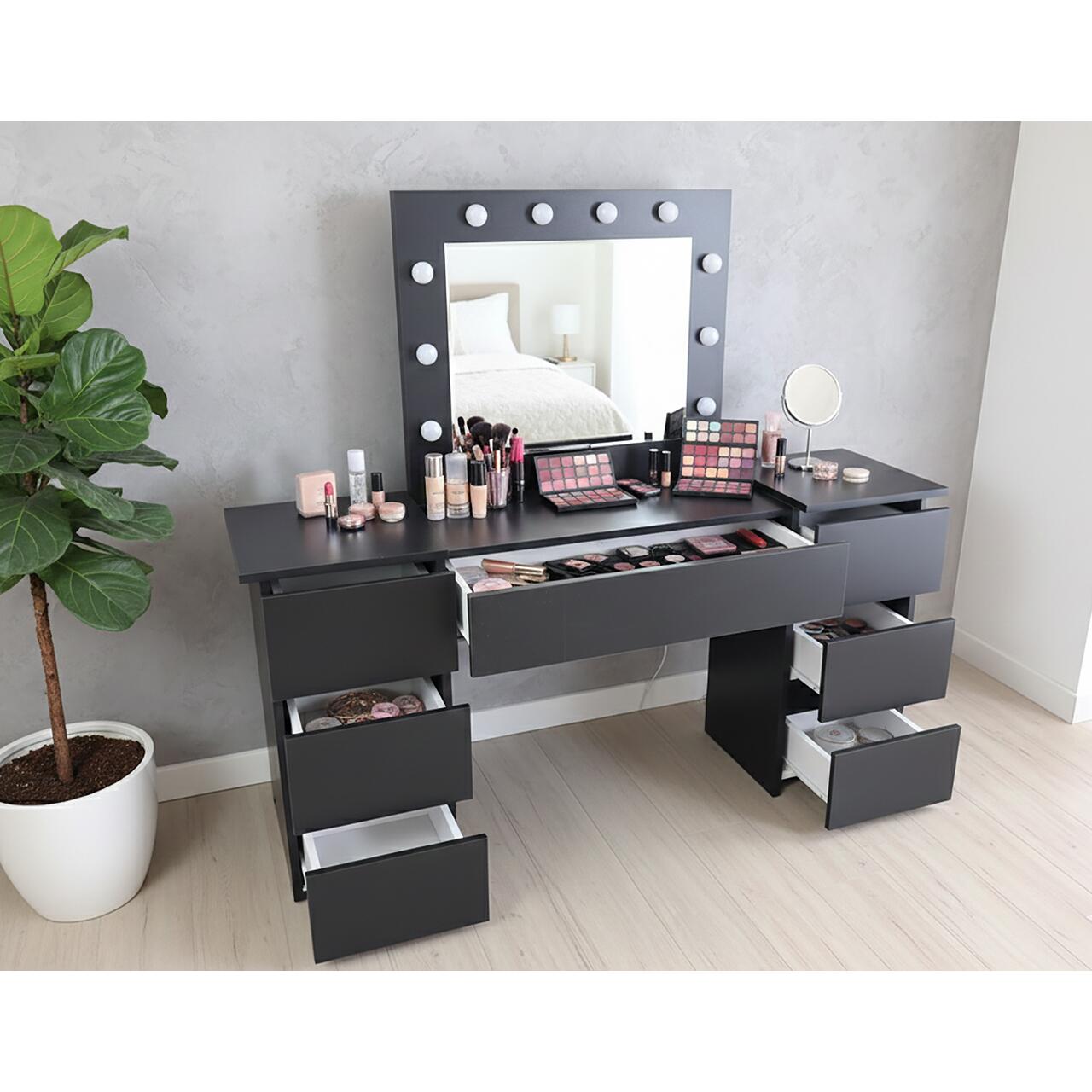 - Spatiu generos de depozitare: Dispune de 7 sertare care permit organizarea eficienta a produselor cosmetice si a accesoriilor