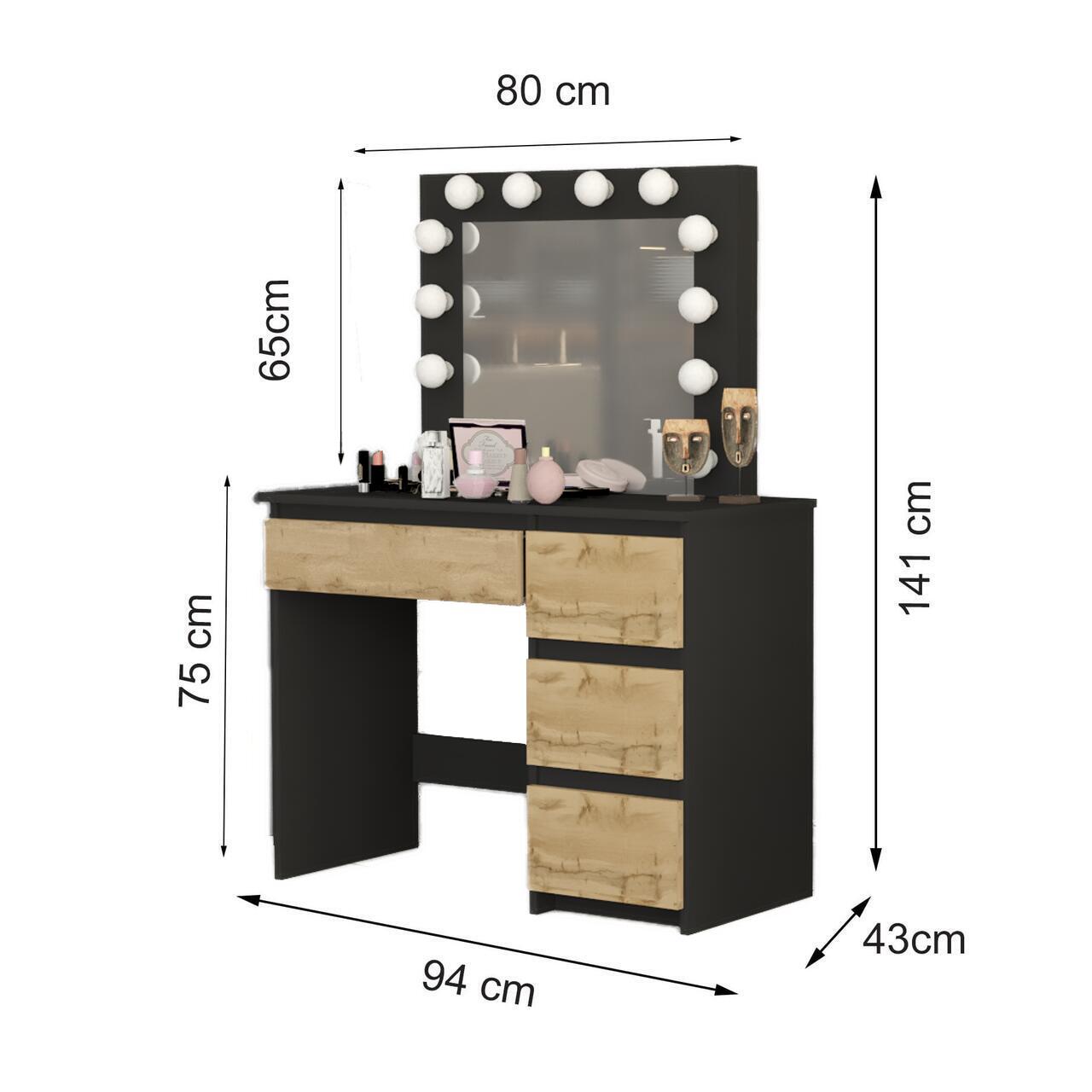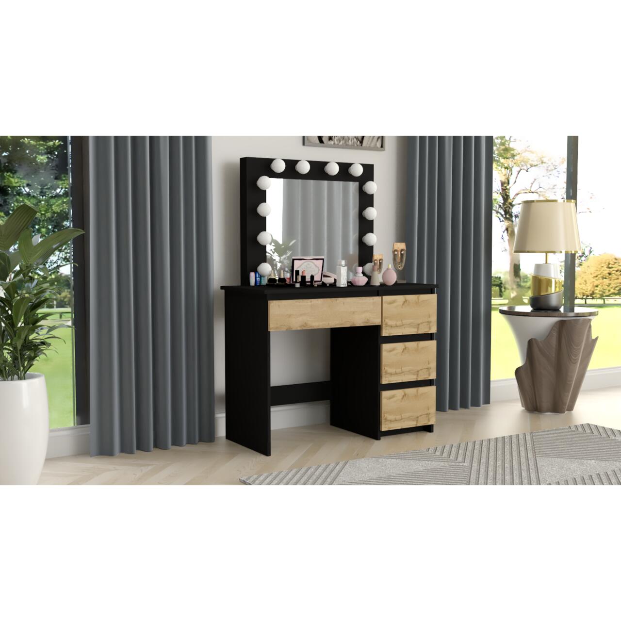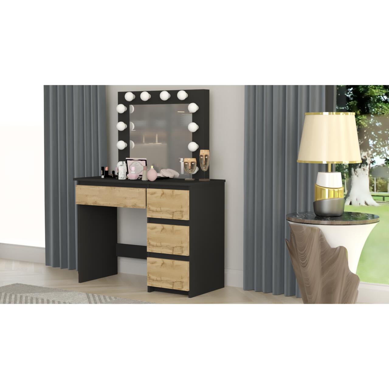 Masa de toaleta/machiaj, negru si stejar Wotan, cu oglinda si LED-uri, Irina, 94x43x141 cm