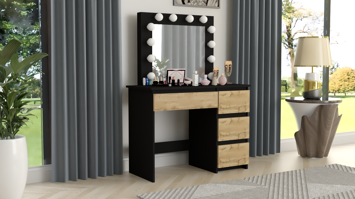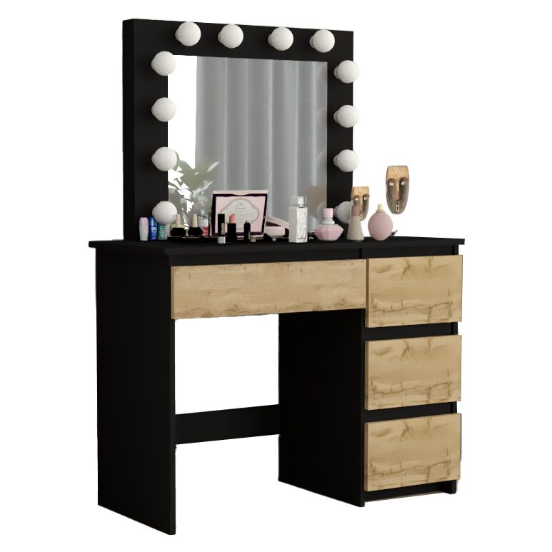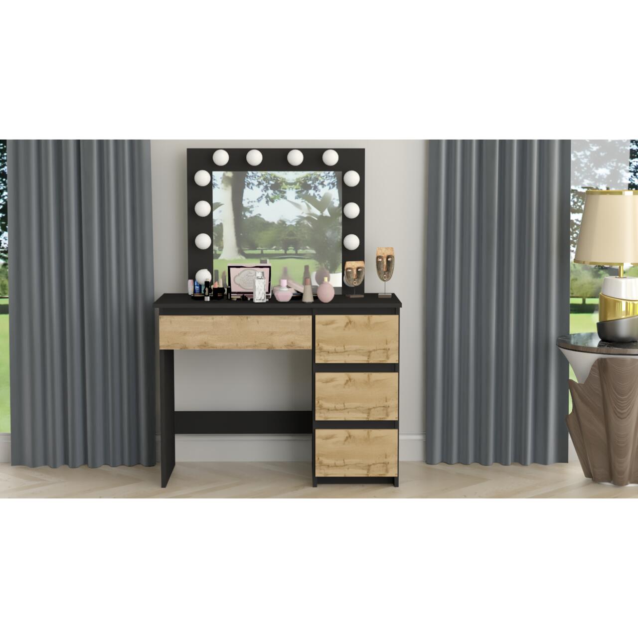 Masa de toaleta/machiaj, negru si stejar Wotan, cu oglinda si LED-uri, Irina, 94x43x141 cm