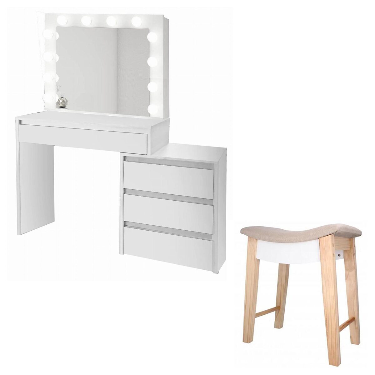 Masa de toaleta/machiaj + Taburet Vintage, alba, cu oglinda si LED-uri, 115x43x145 cm