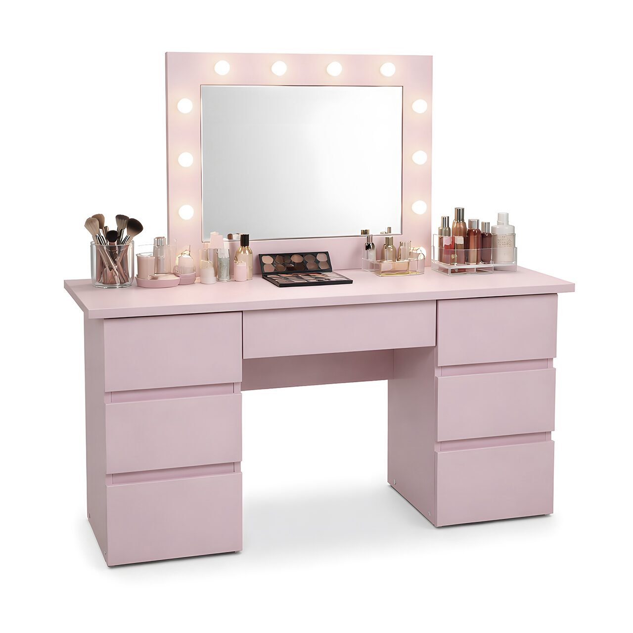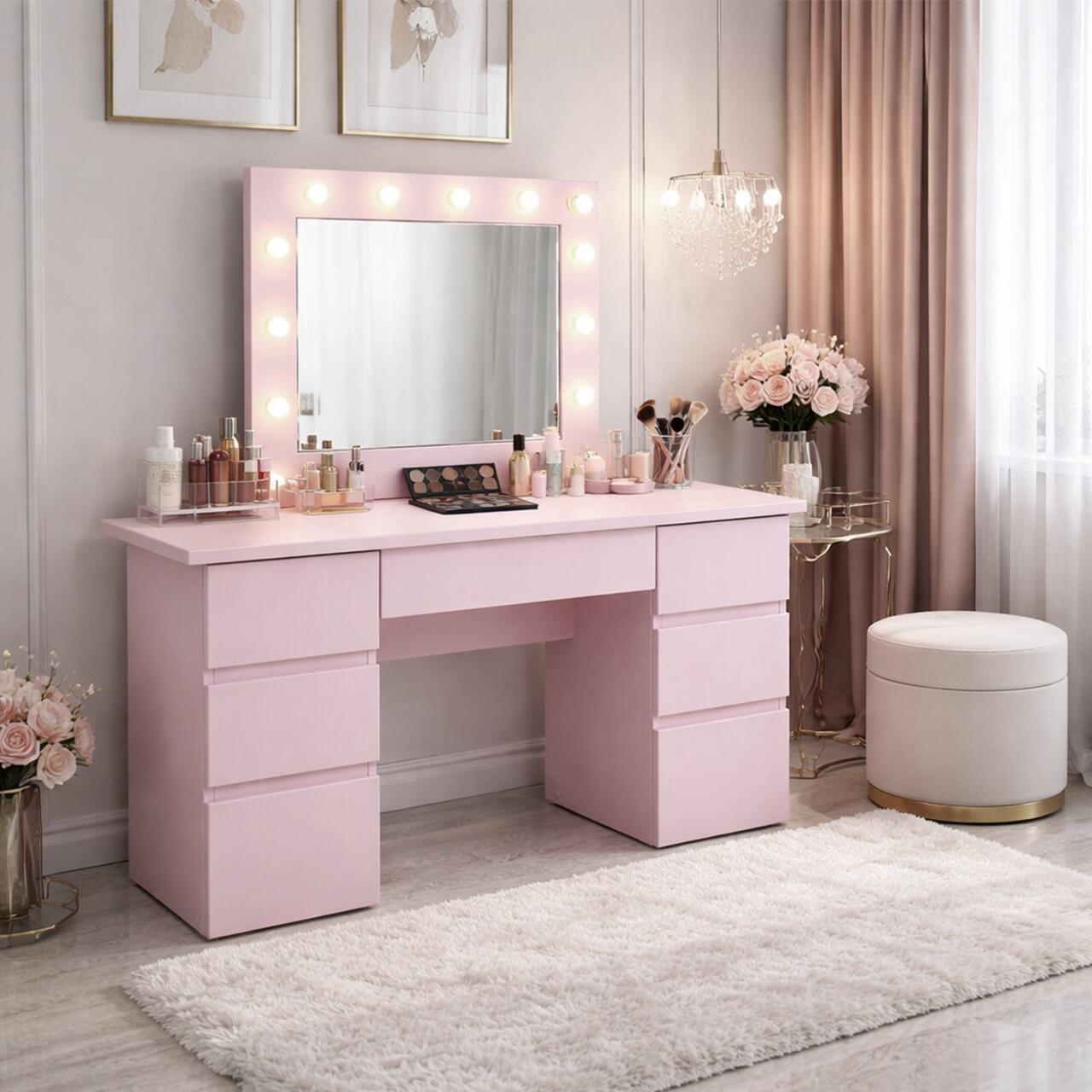 Masa de toaleta/machiaj, Vanessa, roz, cu oglinda si LED-uri, 130x43x143 cm