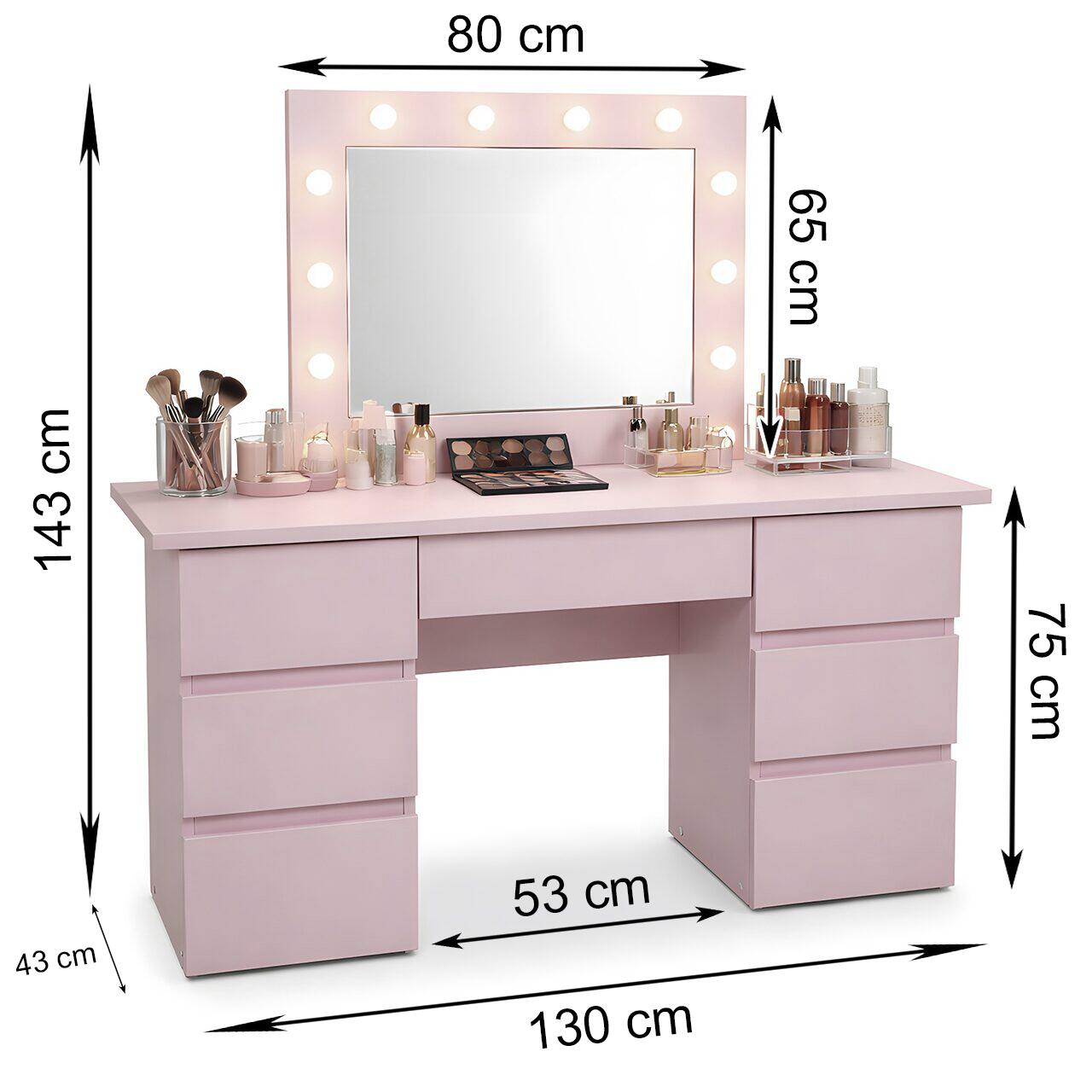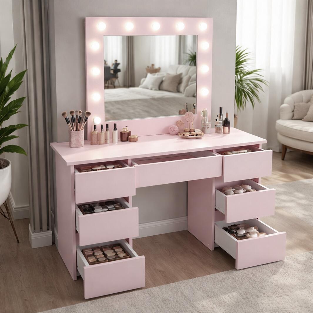 Aceasta masa este prevazuta cu o oglinda mare si 10 becuri LED incorporate, ceea ce o face ideala pentru aplicarea machiajului sau coafurii.