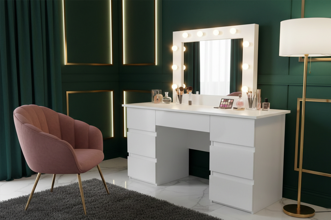 Oglinda mare incorporata in masa de toaleta/machiaj Vanessa ofera o imagine clara si detaliata, ceea ce faciliteaza aplicarea machiajului si coafurii. In plus, lumini LED sunt incorporate in jurul oglinzii pentru a oferi o lumina suficienta pentru a vedea detaliile de care ai nevoie in timp ce te machiezi sau te coafezi. Ele ofera posibilitatea de reglare a temperaturii de culoare. Veti putea, astfel, sa alegeti tipul de lumina care vi se potriveste cel mai bine (calda, rece sau neutra).