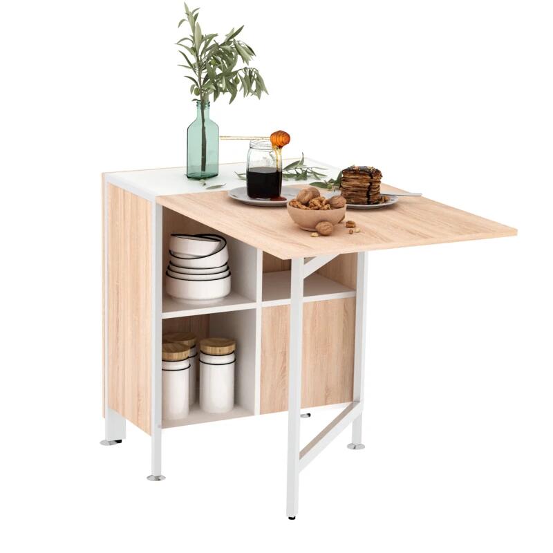 Masa pentru sufragerie/living, extensibila, MDF, metal, alb si stejar, 3 rafturi interioare, 33-169x62x75 cm