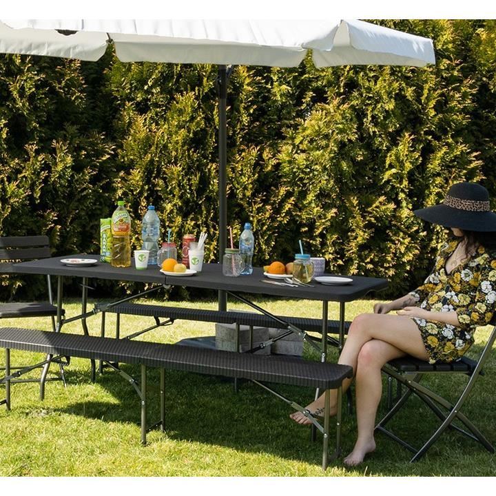 - LONG TOP TABLE - este o masa de gradina pliabila cu un blat de masa lung de 180 cm. O lungime atat de mare a blatului mesei o face perfecta pentru un grup mai mare de oameni care sarbatoresc impreuna.
