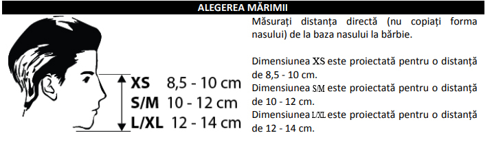 Puteti utiliza urmatoarea metoda pentru a masura dimensiunea fetei: inchideti gura si masurati distanta dintre marginea barbiei si a sprancenelor. Daca distanta este mai mica de 12 cm, alegeti dimensiunea S. Daca distanta este mai mare, alegeti L.