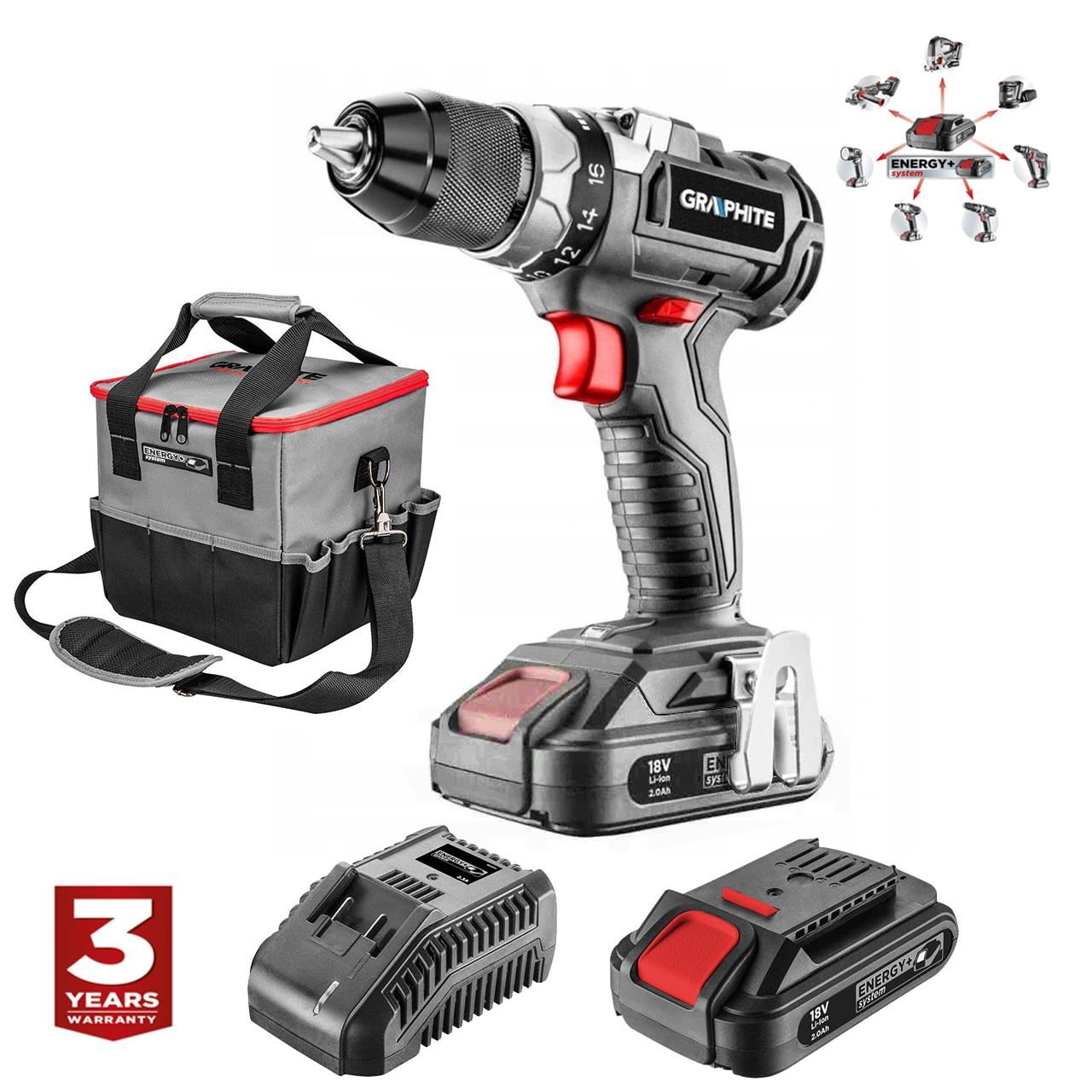 Masina de gaurit, insurubat (bormasina), cu 2 acumulatori 2 Ah, incarcator, 18 V Li-ion, geanta, fara perii, mandrina 2-13 mm, Graphite Energy