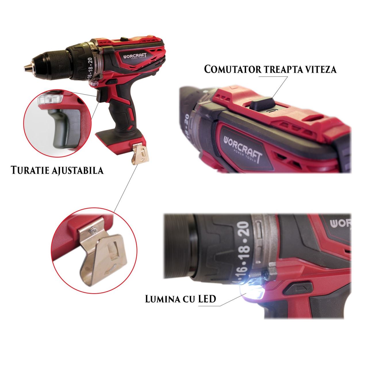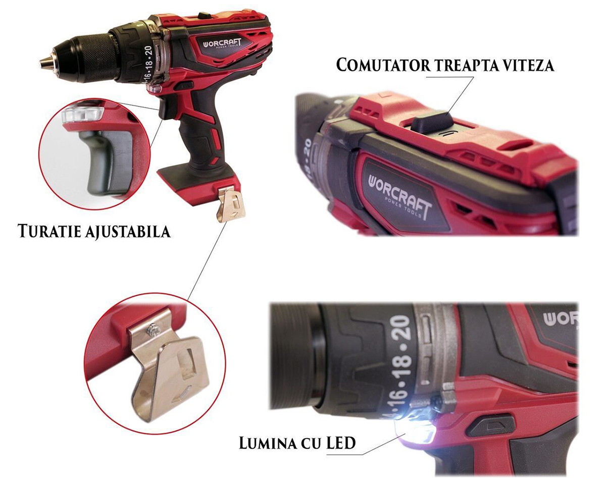 Masina de gaurit cu acumulator 20 V, 4 Ah Li-Ion, WORCFRAFT este conceputa pentru gaurirea diferitelor materiale.