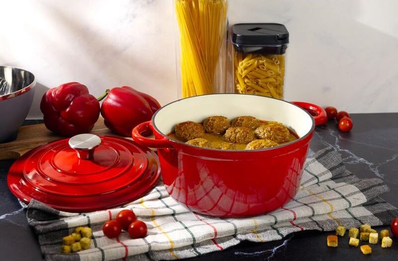 - Un alt beneficiu notabil este distributia uniforma a caldurii oferita de oala de fonta. Datorita proprietatilor termice exceptionale ale fontei, caldura este dispersata uniform pe intreaga suprafata a oalei. Acest lucru asigura o gatire uniforma a alimentelor, evitand astfel arderea sau coacerea inegala. Capacul oalei contribuie, de asemenea, la pastrarea umiditatii si a aromei, garantand ca preparatele tale vor fi mereu suculente si pline de gust.