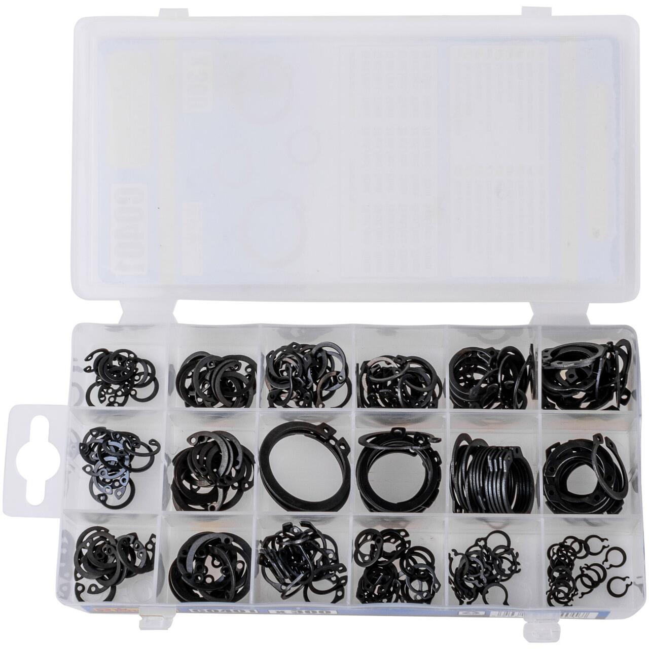 Setul include inele externe si interne de tip SEGER. Inelele sunt folosite pentru a incuia si proteja impotriva alunecarii de teren. Au fost fabricate din otel elastic.