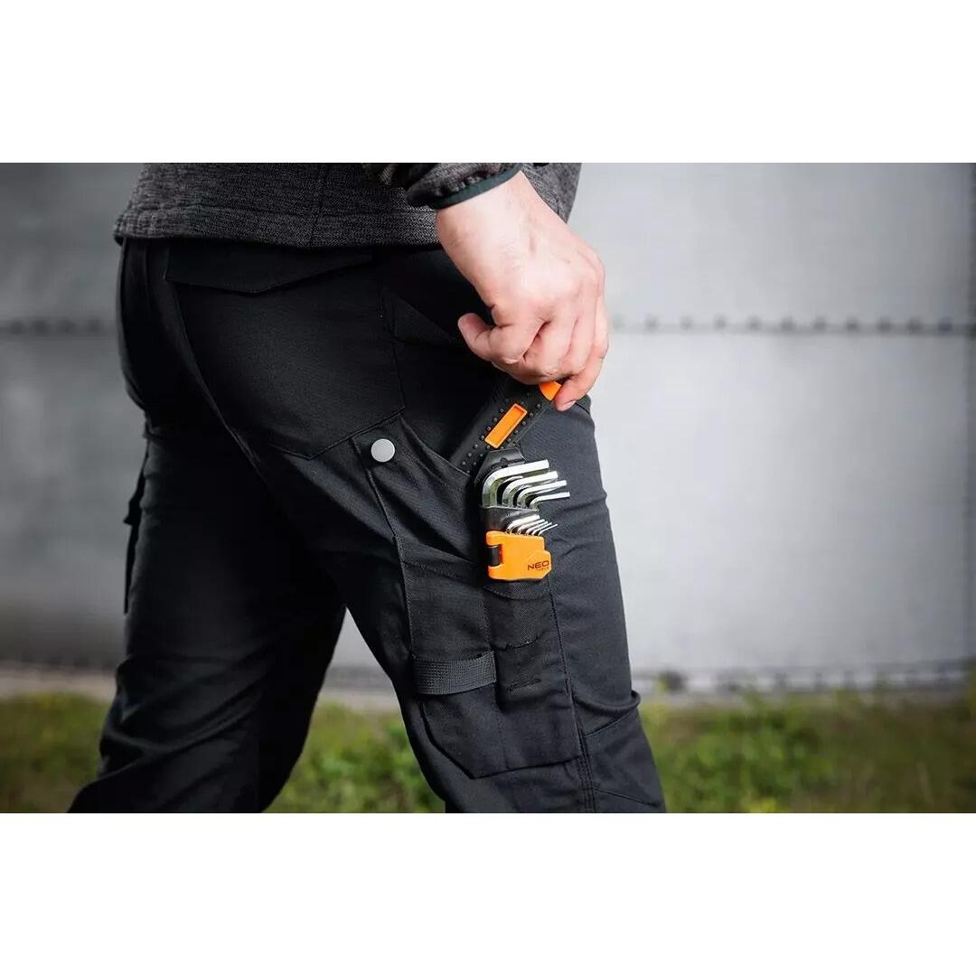 - Caracteristicile practice, precum un buzunar pentru scule la coapsa cu o clema in forma de nasture, suport pentru legitimatie de identitate, agatatoare pentru scule tip chinga si detaliile reflectorizante de pe buzunarul lateral, fac ca acesti pantaloni sa fie ideali pentru utilizarea de zi cu zi si pentru majoritatea industriilor.