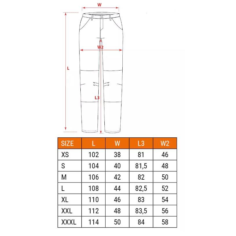 Pantalonii sunt echipati cu 5 buzunare multifunctionale si incapatoare, dar si un buzunar suplimentar in partea de jos a piciorului. La nivelul picioarelor si sub genunchi, sunt dotati cu un strat de material cusut care intareste pantalonii impotriva uzurii.