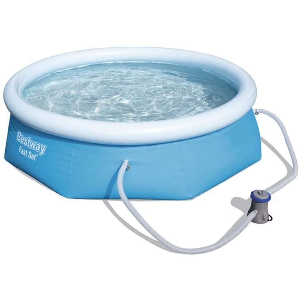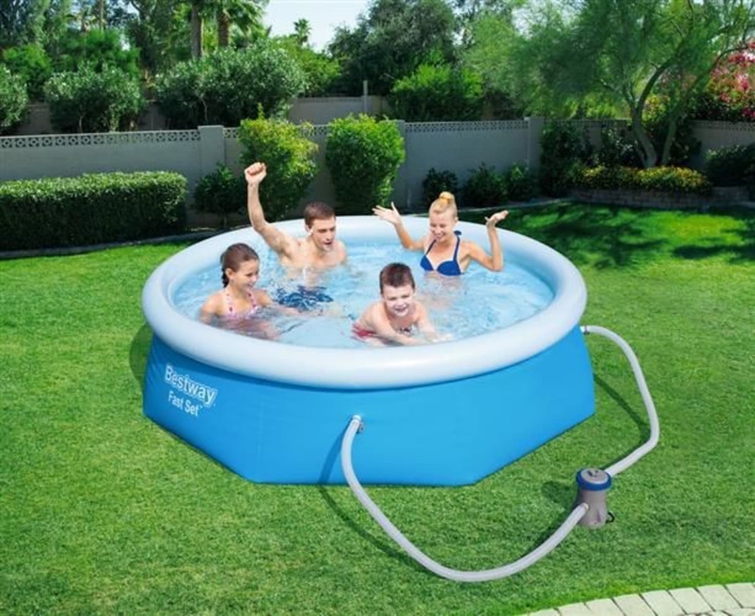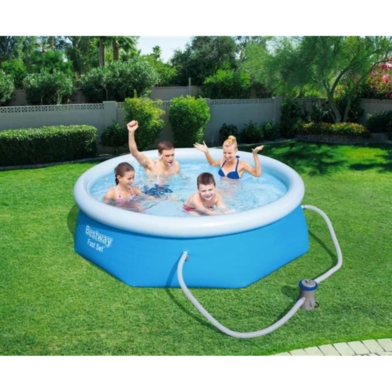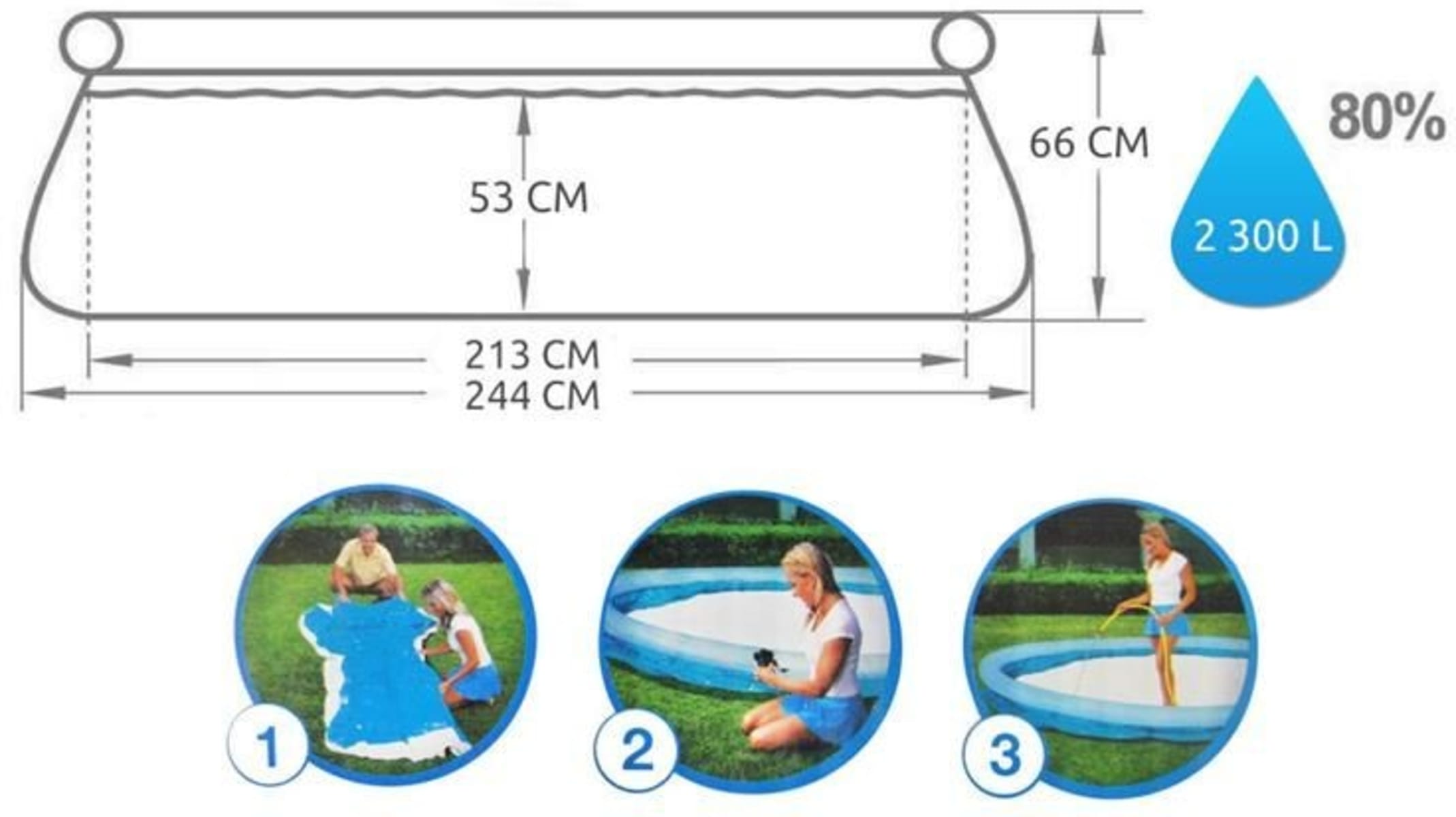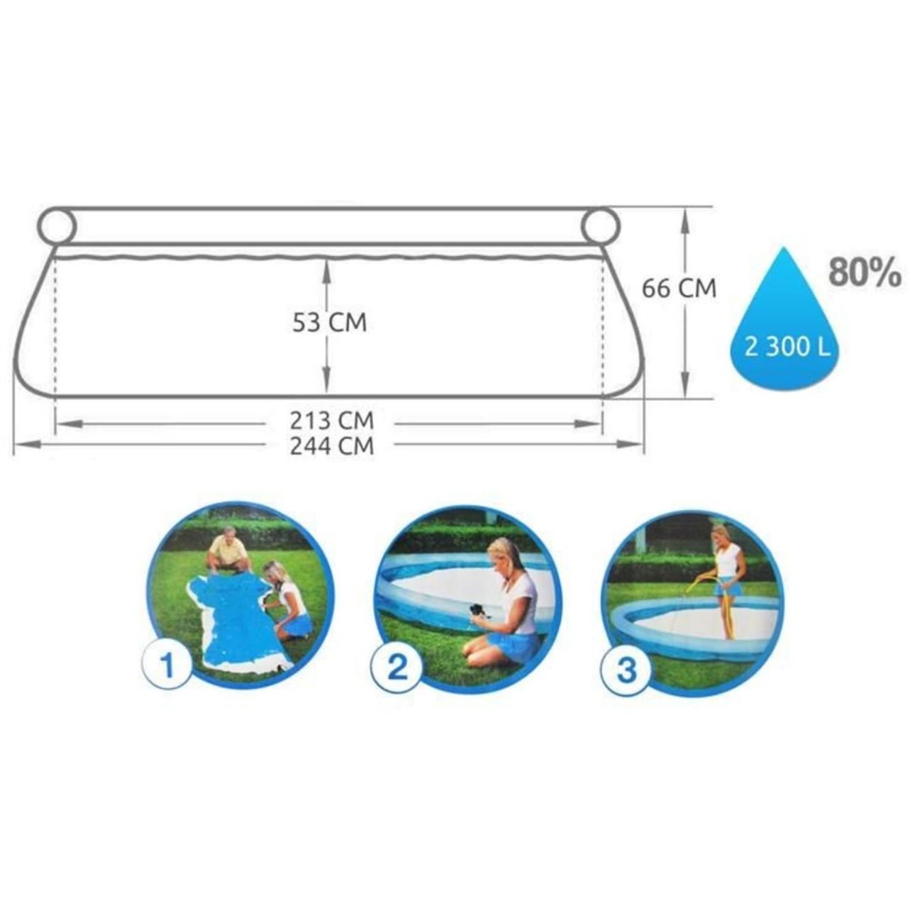 Piscina trebuie umpluta cu 2.300 litri de apa pentru o utilizare confortabila. Datorita pompei de filtrare cu un debit de 1249 l/h, pe care o are piscina, apa va fi intotdeauna curata si proaspata.