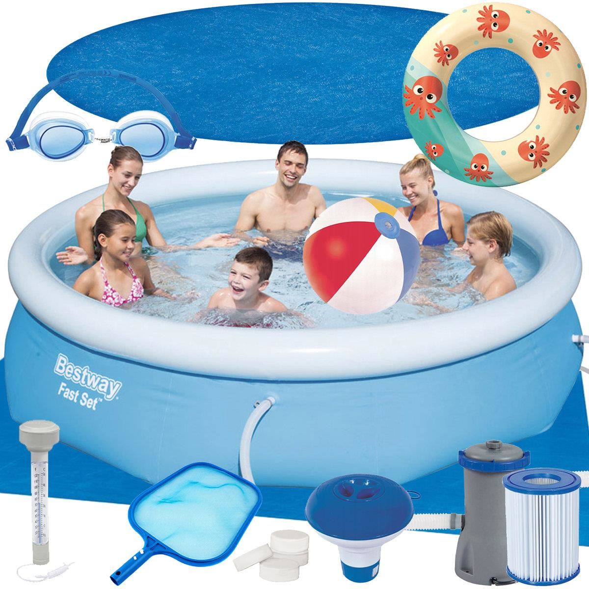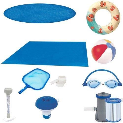 - SET 20 IN 1 - tot ce ai nevoie pentru o baie relaxanta si distractiva este inclus in set. Exista chiar si jucarii cu care copiii se pot juca, precum: un colac; minge si ochelari. Pe langa piscina, setul include: o pompa de filtru cu accesoriile necesare racordarii acesteia si un filtru; prelata; covoras de piscina; termometru; minciog; 4 tablete clor, plasture de reparare si dozator de clor.