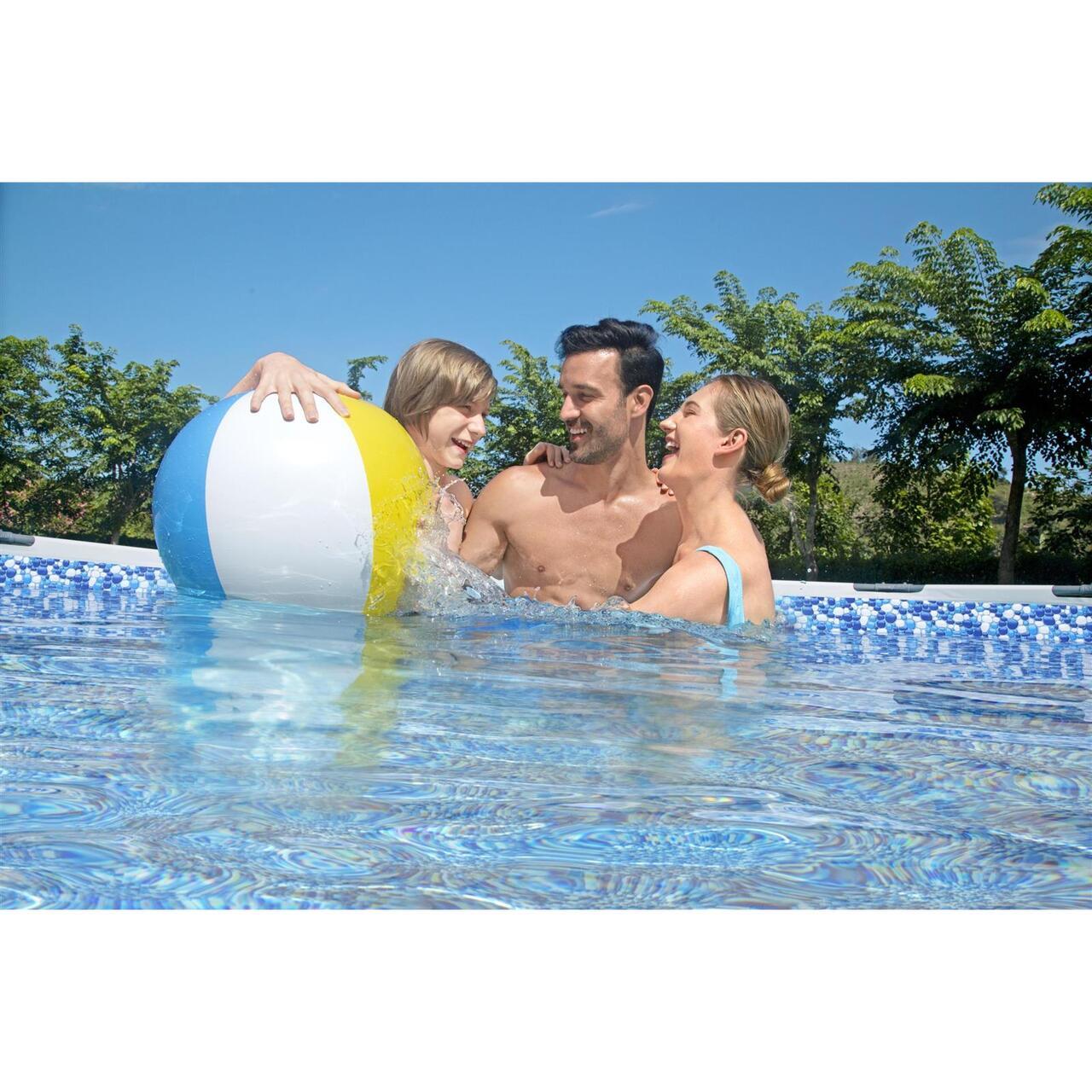 - Pachetul contine tot ceea ce este necesar pentru a va bucura de o piscina frumoasa in gradina, dar si pentru intretinerea ei: filtru, prelata de acoperire, o pompa, o scara si un dozator (care mentine apa curata oferind un nivel stabil de clor). Veti beneficia de asemenea de un plasture adeziv de buna calitate pentru reparatii urgente in cazul in care unul dintre peretii laterali este strapuns. Plasturele va rezista cu succes presiunii apei.