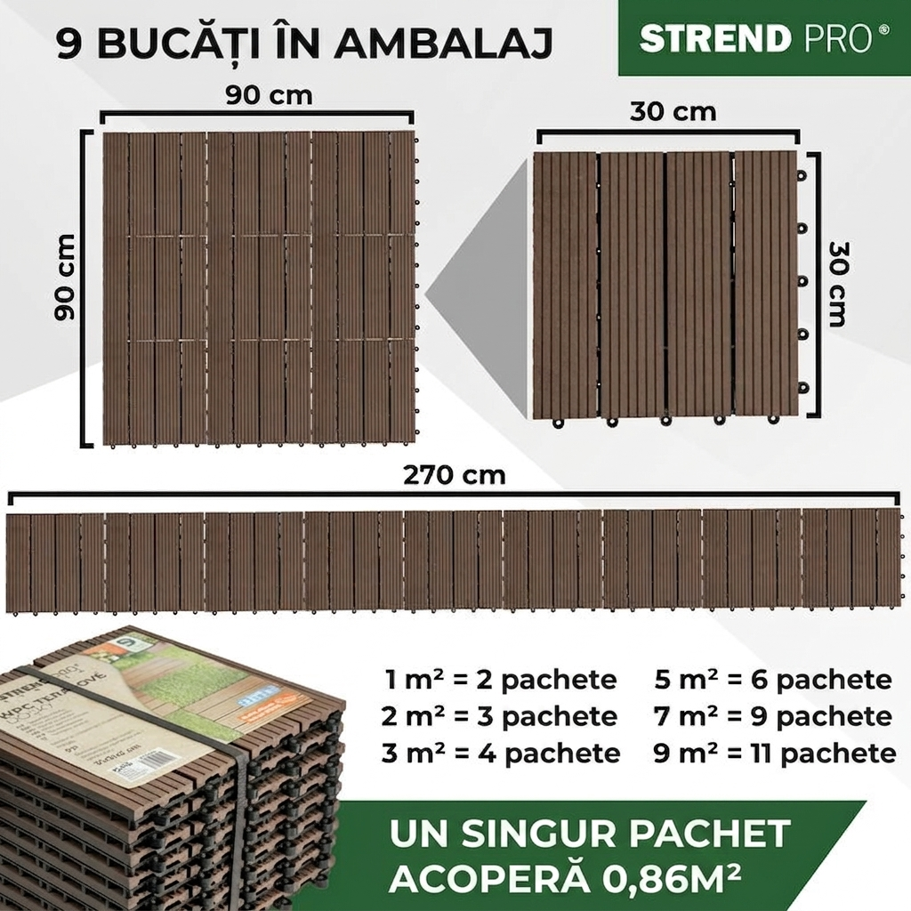 - Pachetul contine 9 placi care acopera o suprafata de 0.86 m2.