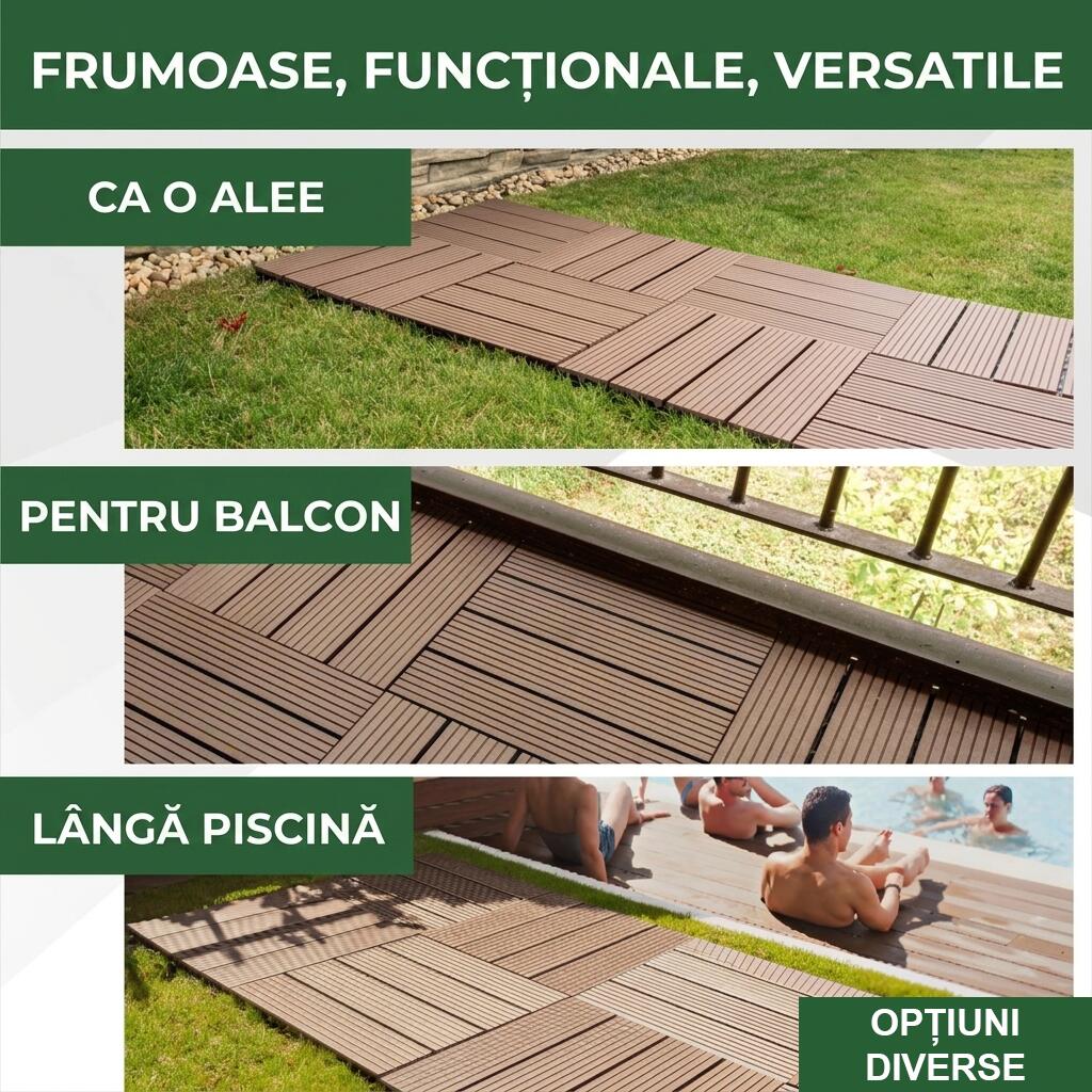 - Reprezinta o solutie practica si estetica pentru decorarea teraselor, balcoanelor, aleilor sau a zonelor din jurul piscinelor. Placile sunt realizate intr-o combinatie de maro si gri, ceea ce confera suprafetei un aspect modern, imitand cu fidelitate textura scandurilor de lemn.