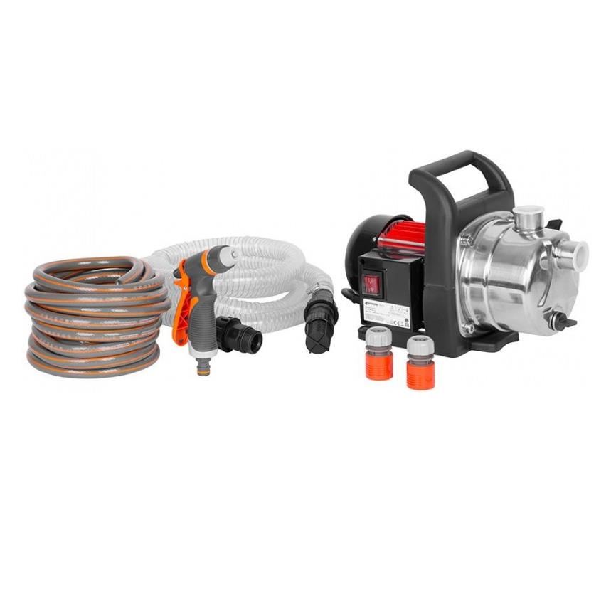 SET-ul include: pompa, furtun de aspiratie 1"x3.5 m, furtun de gradina cu 3 straturi 1/2"x7 m, 2 x cuple rapide 1/2" si duza reglabila cu 2 functii.
