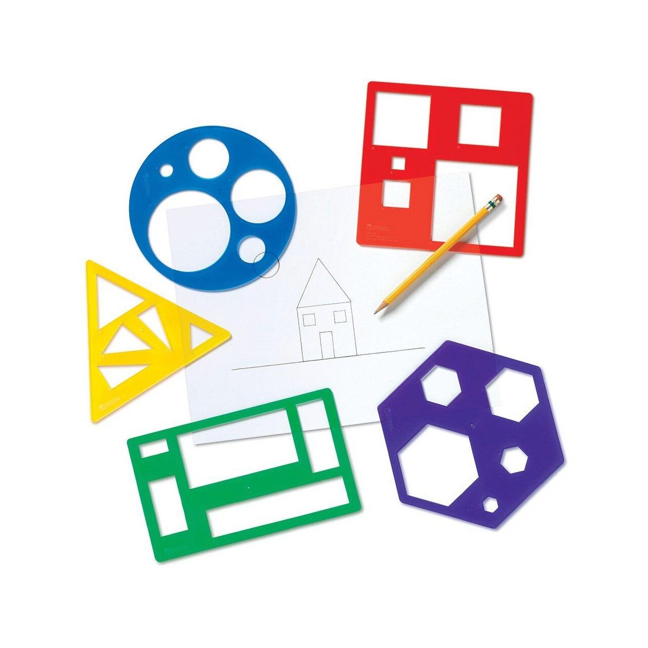 - setul include 5 sabloane de diferite dimensiuni si forme, realizate din plastic rezistent: cerc, triunghi, dreptunghi, patrat si hexagon