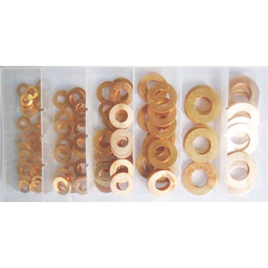 Setul de saibe de cupru contine 150 de piese, de 19 marimi diferite, asambalte intr o cutie practica compartimentata, astfel: