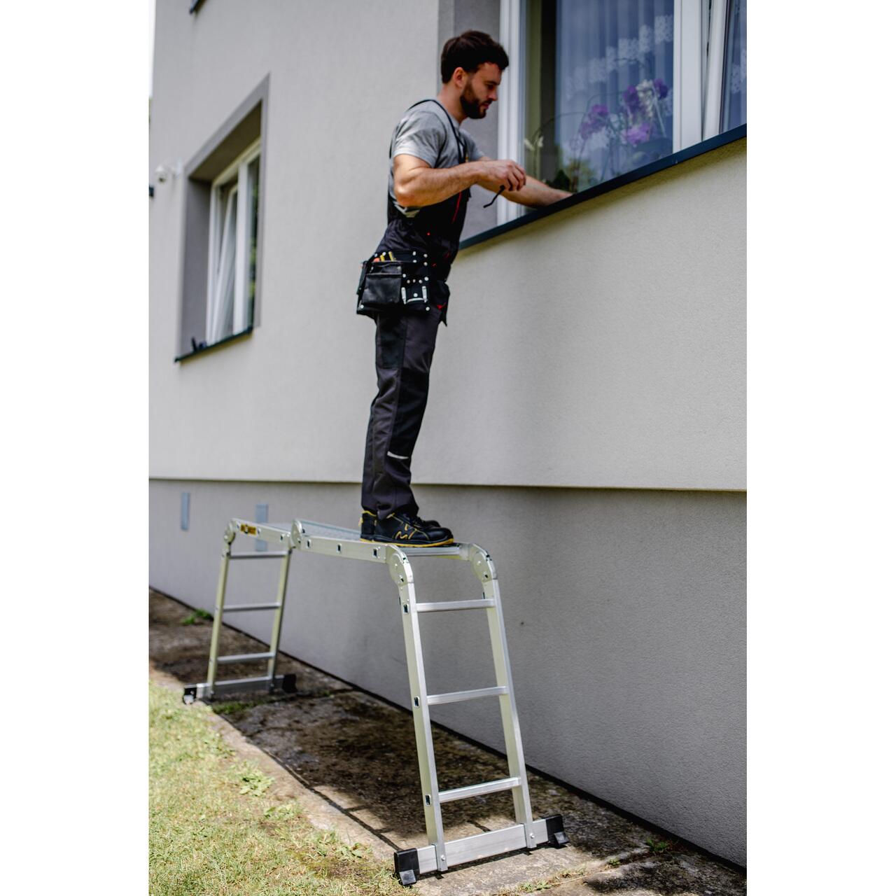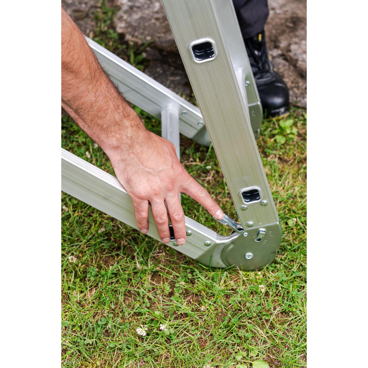 - Este o scara extrem de versatila si practica pentru lucrul in casa sau gradina. Poate fi desfasurata in patru moduri, ceea ce va permite sa-i reglati inaltimea pentru a se potrivi diferitelor sarcini.