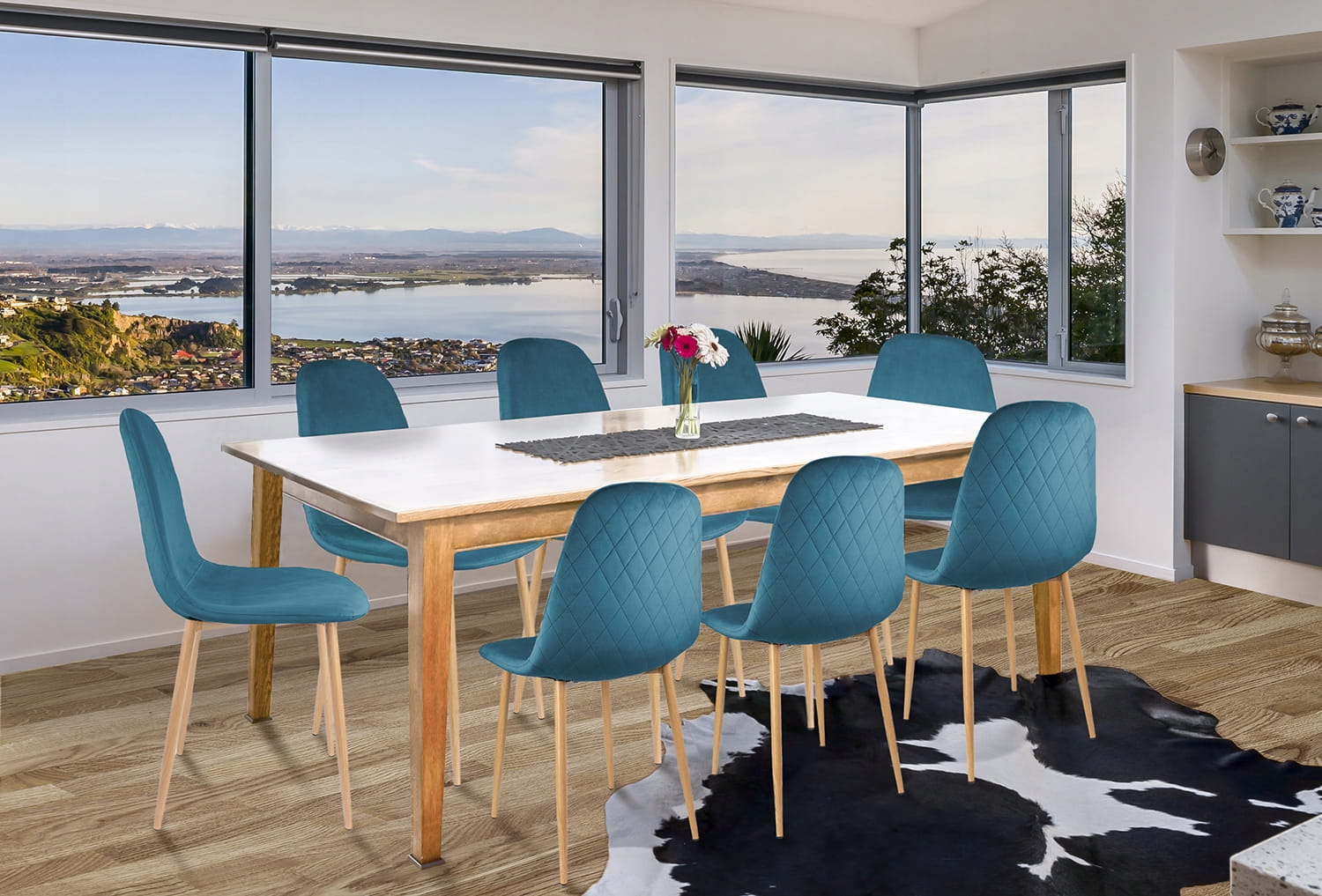 Scaun bucatarie/living, Jumi, Vigo, catifea, metal, albastru marin si natur, 44x52x85 cm