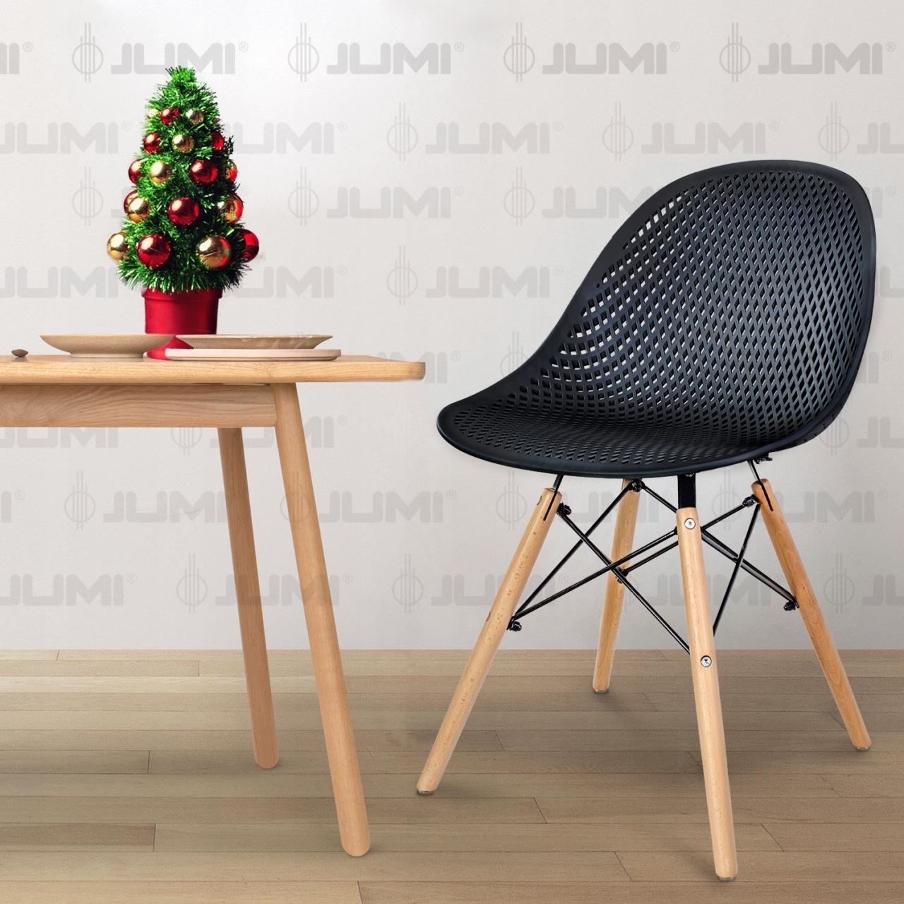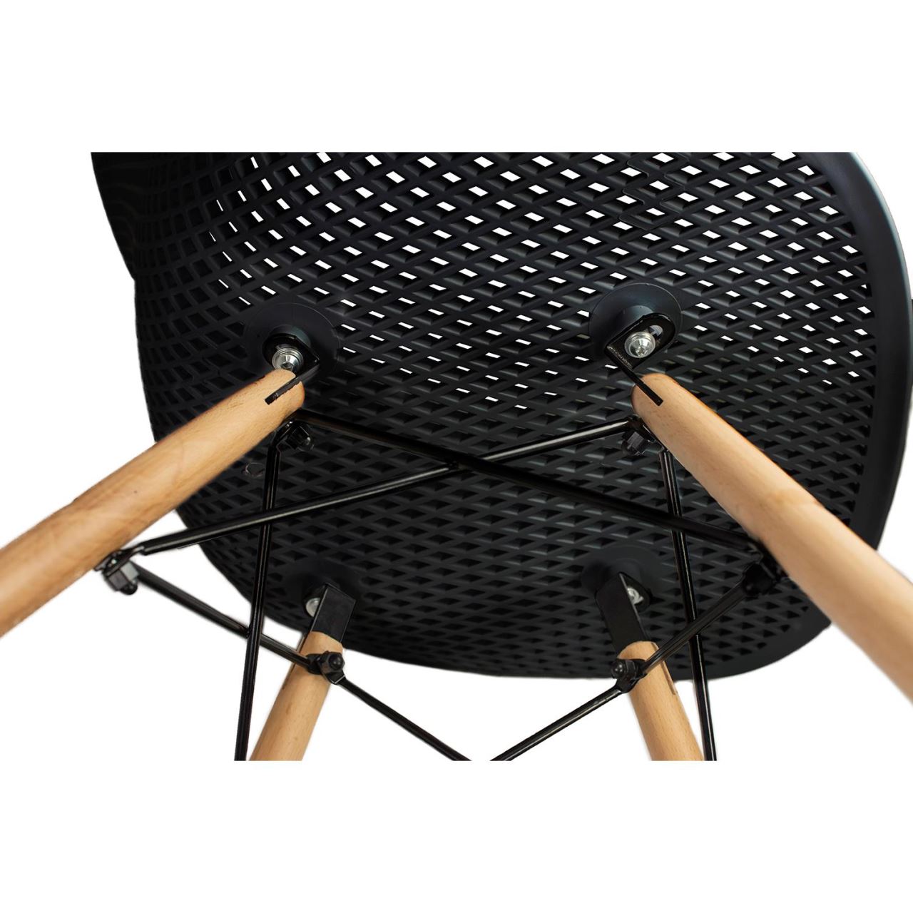 Sezutul si spatarul seamana cu o plasa tridimensionala, datorita careia scaunul pare extrem de usor si modern. Picioarele sunt realizate din lemn masiv de fag natural care asigura durabilitate si stabilitate in timpul utilizarii, iar rosturile negre intaresc intregul cadru si sunt totodata un decor.