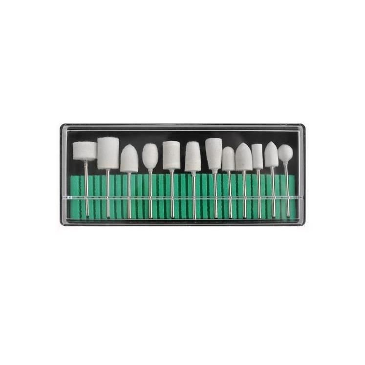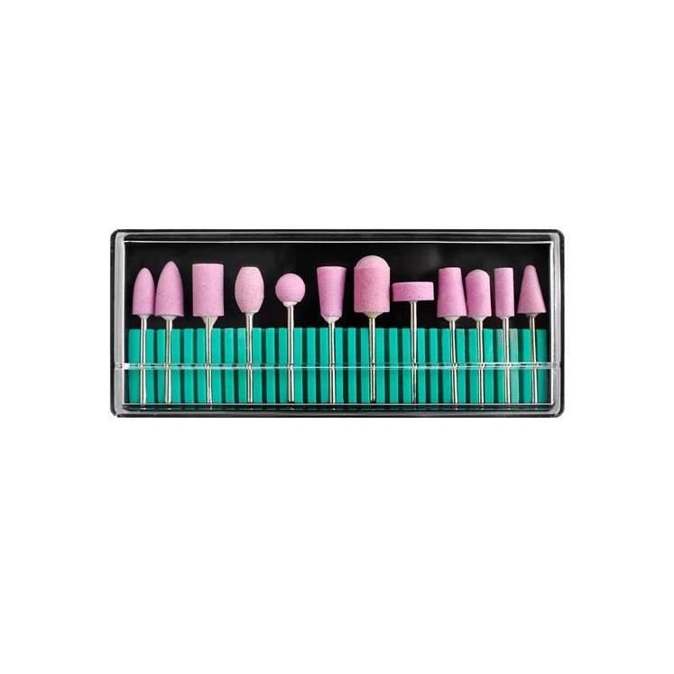 - 12 CAPETE DE PIATRA - un set din piatra prelucrata, mai exact oxid de aluminiu, de granulatie medie. Frezele pot fi folosite atat uscate, cat si umede. Sunt perfecte pentru tratamentul de manichiura, pedichiura si podiatrie. Setul este reutilizabil, poate fi sterilizat si dezinfectat. Capacele incluse in set sunt puse pe suport, utilizarea lor influenteaza igiena corespunzatoare in timpul procedurii.