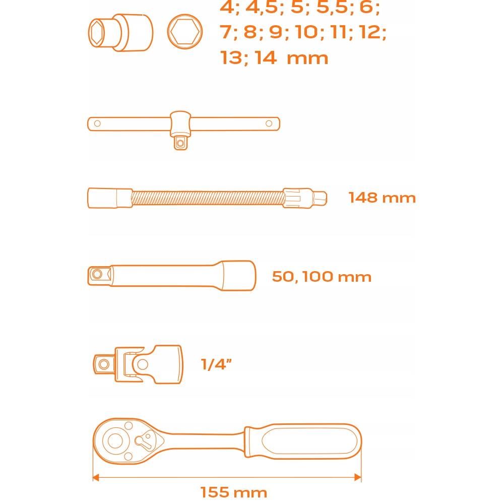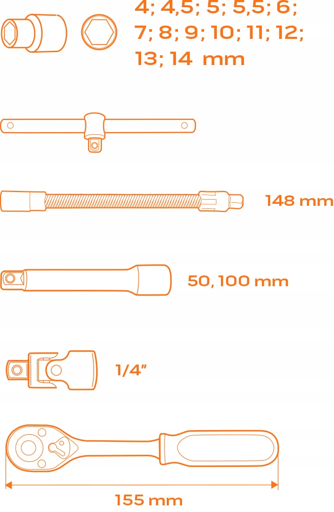 - 13 x tubulare hexagonale: 4, 4.5, 5, 5.5, 6, 7, 8, 9, 10, 11, 12, 13, 14 mm
