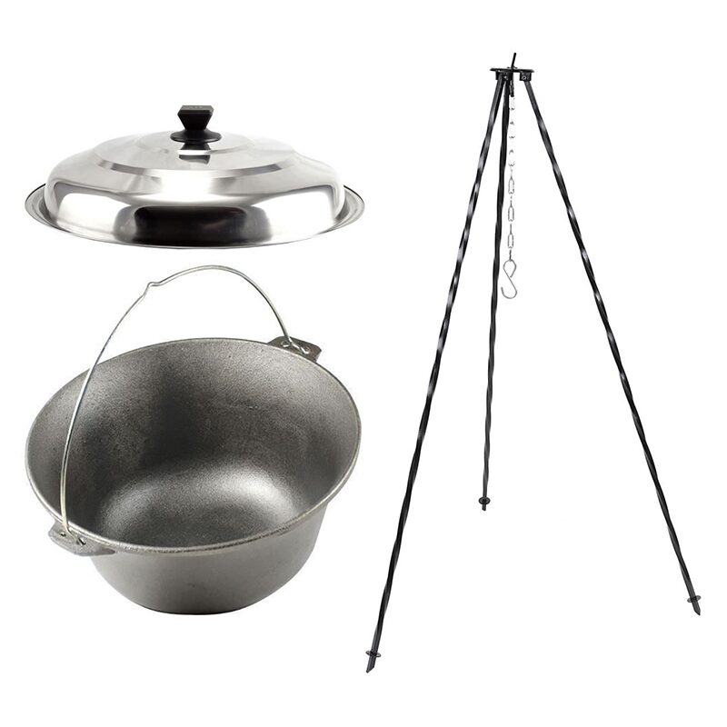 - Set complet pentru gatit: Include ceaun, capac si trepied, oferind toate accesoriile necesare pentru gatitul traditional