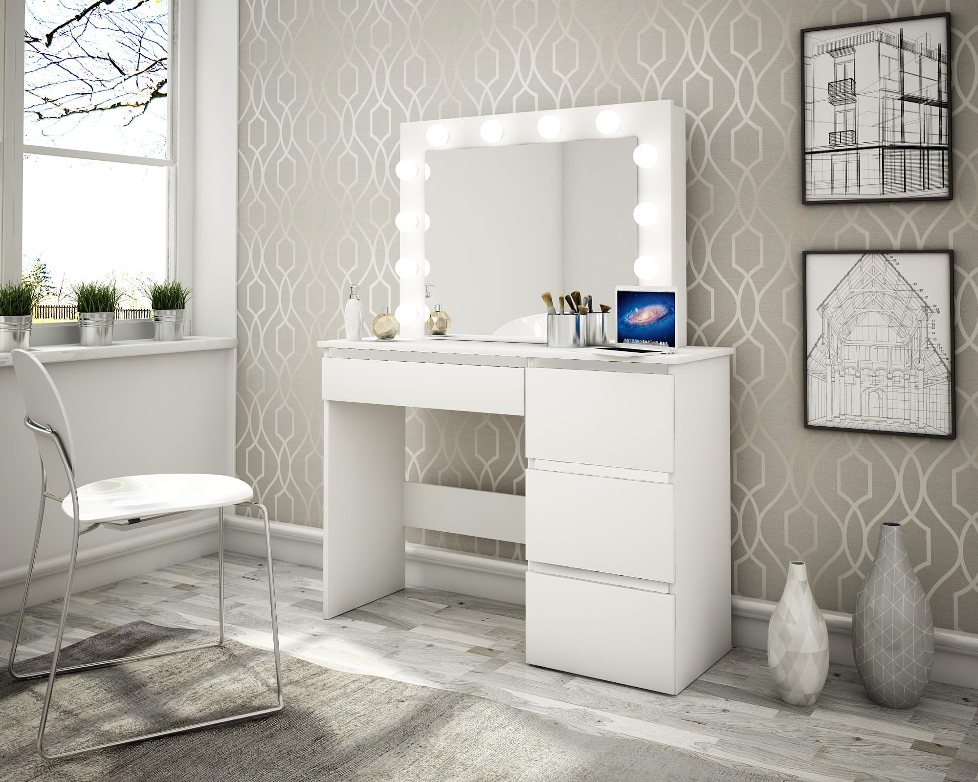 - Scaun inclus: Setul include un scaun confortabil care completeaza functionalitatea si estetica a mesei de toaleta
