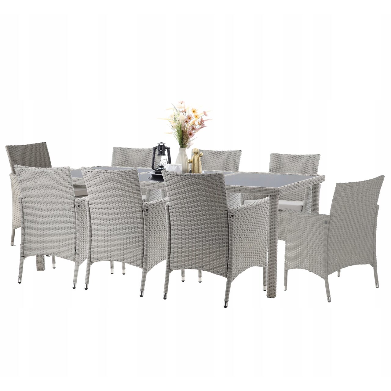- Reprezinta setul ideal pentru o masa cu familia sau o intalnire cu prietenii in curte sau pe terasa. Pachetul cuprinde 8 fotolii confortabile si o masa mare, asortata. Setul poate fi folosit cu incredere pentru amenajarea oricarei gradini. Se va potrivi perfect cu majoritatea stilurilor de decorare.