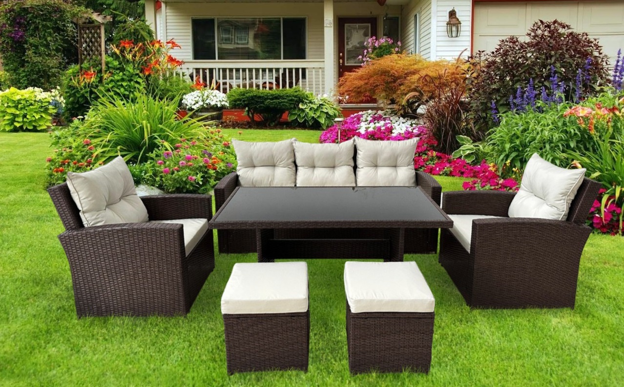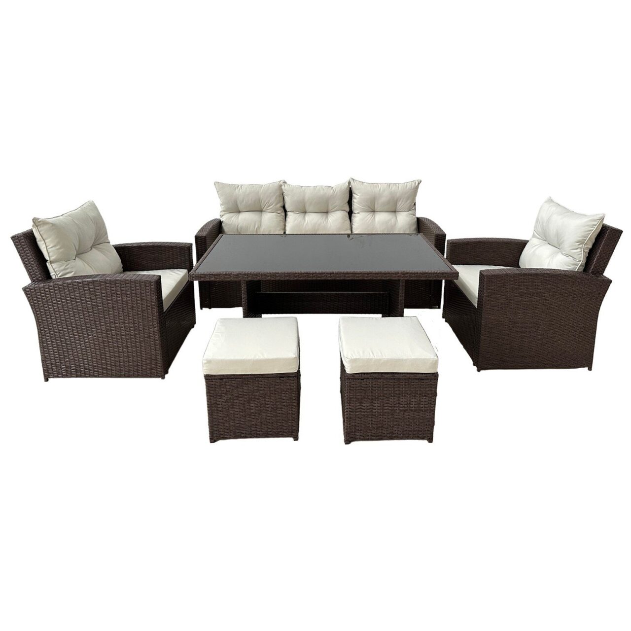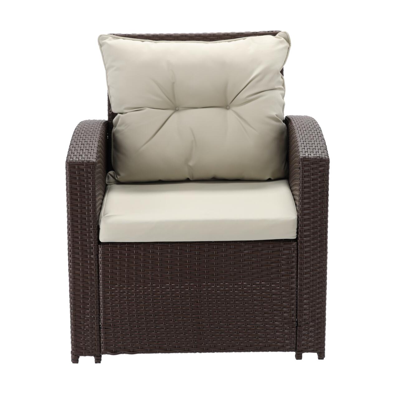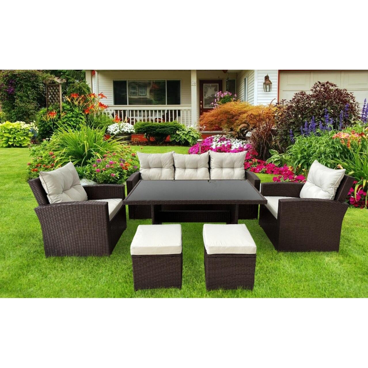 Set mobilier gradina/terasa, maro si bej, ratan sintetic, 1 masa, 2 scaune, 2 tabureti, 1 canapea, Dolores