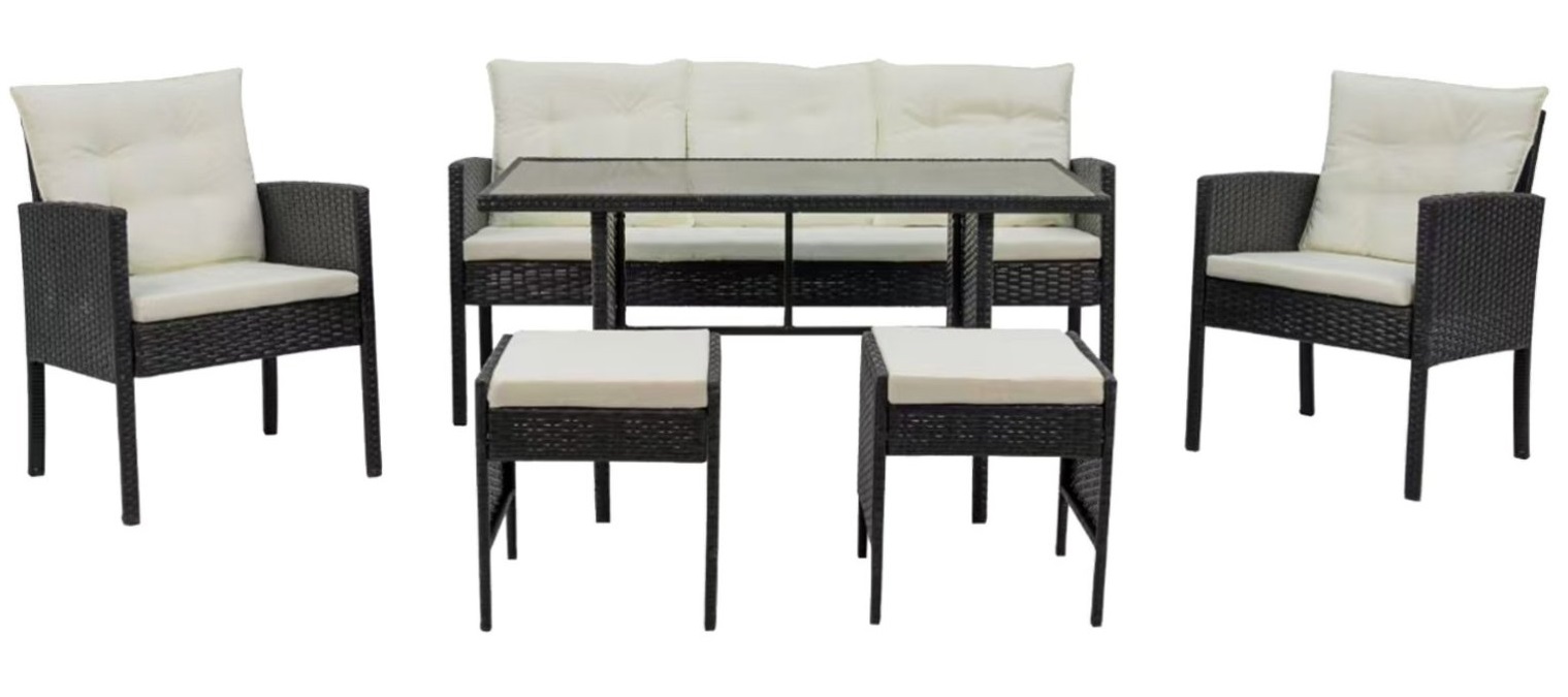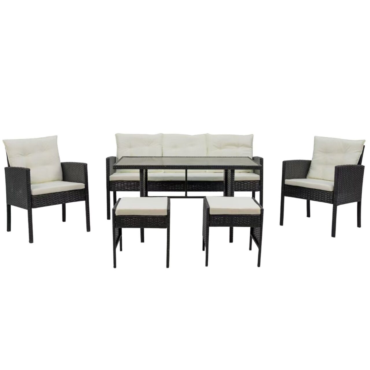 Set mobilier gradina/terasa, negru si bej, ratan sintetic, 1 masa, 2 scaune, 1 canapea, 2 tabureti, Vaduz