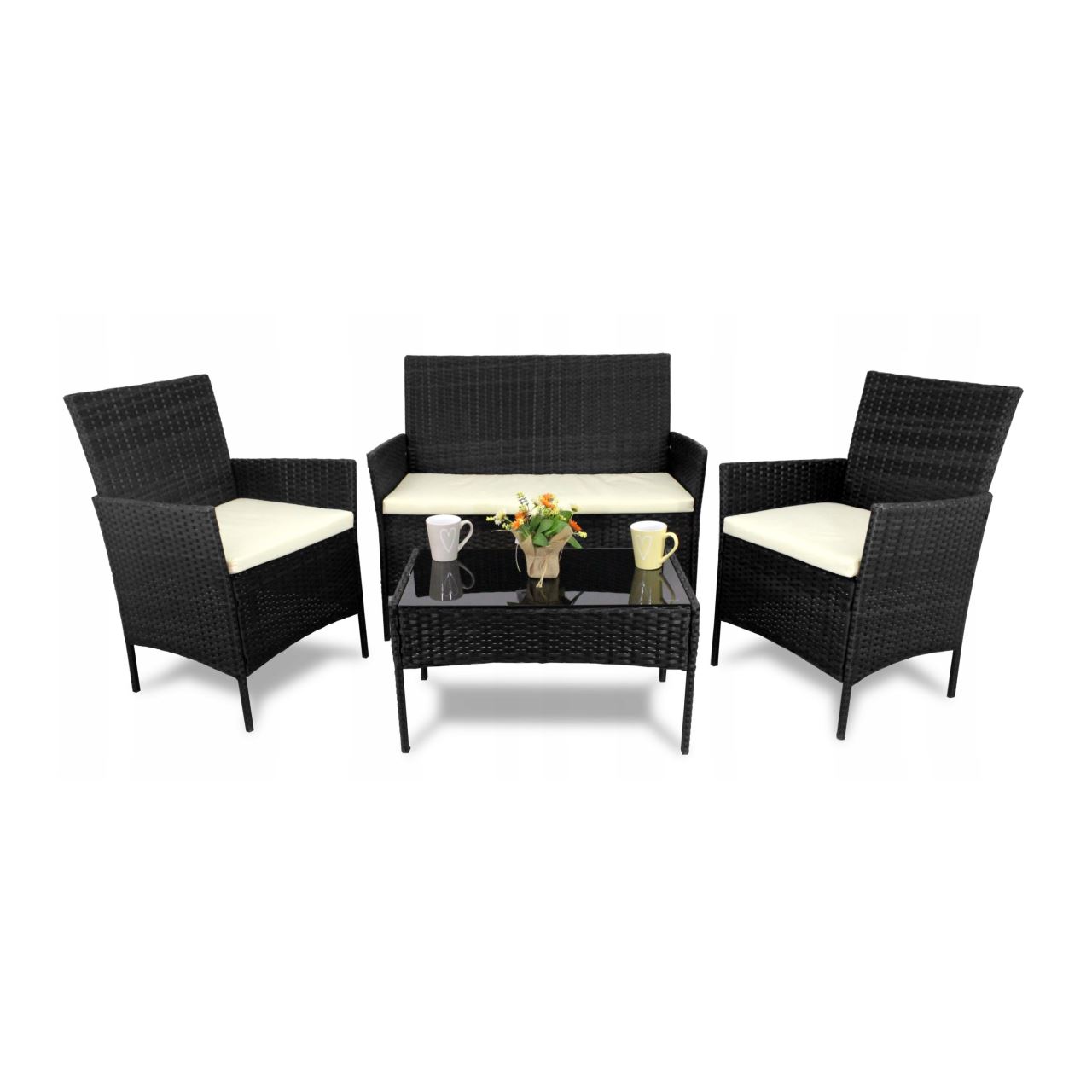 Set mobilier gradina/terasa, poliratan, negru cu perne crem, 1 masa, 2 fotolii, 1 canapea, Medi