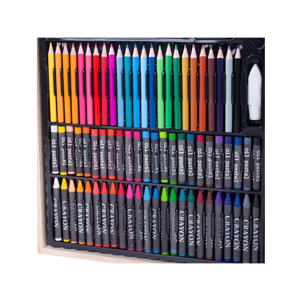 - Fiind dotat cu o selectie larga de 24 de creioane colorate diferit, 36 de markere, 24 de pasteluri cu ulei, 24 de creioane din ceara, 12 acuarele, dar si accesorii precum ascutitoare, lipici, foarfeca sau radiera, acest set ajuta la realizarea chiar si a celor mai complexe, imaginative si originale lucrari.