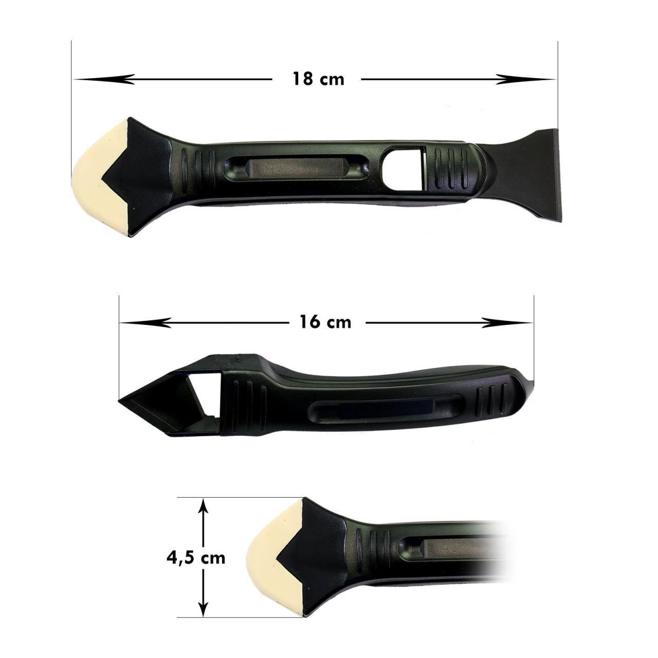 * Racleta din plastic din set poate fi folosita la indepartarea siliconului invechit special conceputa pentru a fi utilizata in doua sensuri inainte si inapoi SCURTAND timpul de lucru, IDEALA pentru reaplicarea etansantului la marginea chiuvetelor,bailor si dusurilor lasandu-le protejate si aratand ca noi.Are de asemenea si un taietor pentru varfurile de la cartusele de etansant.