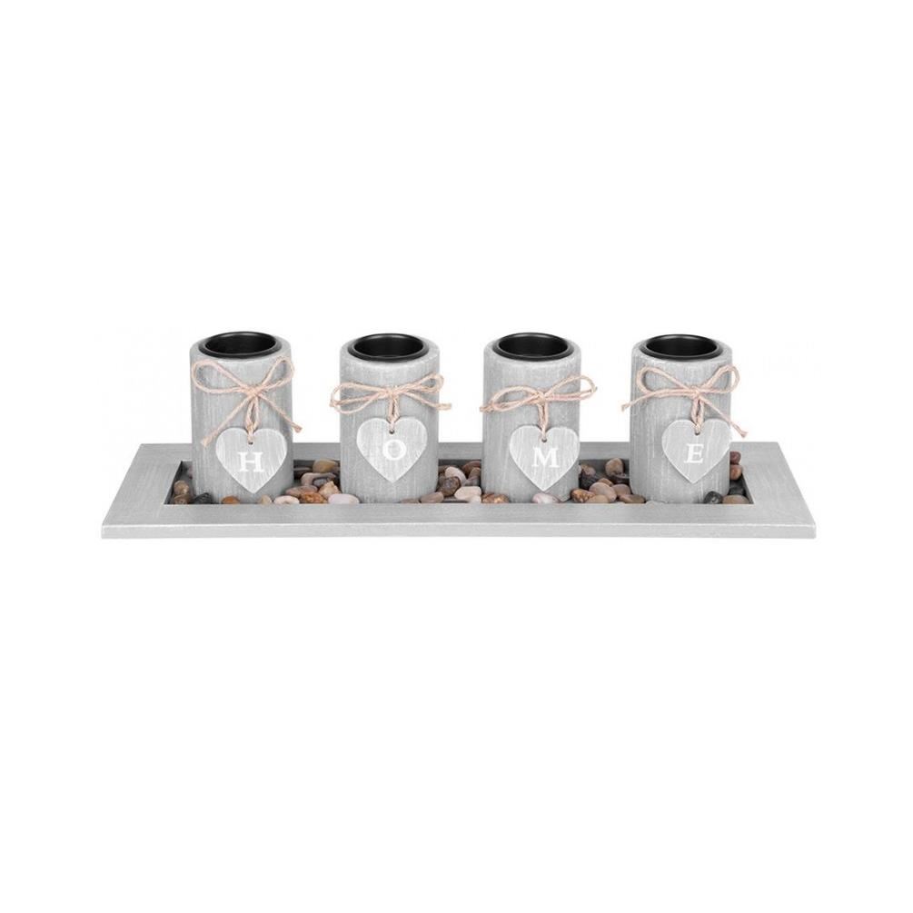 Suport 4 lumanari, model HOME, lemn si pietre naturale, gri, 39x12.5x10 cm, Magic Home