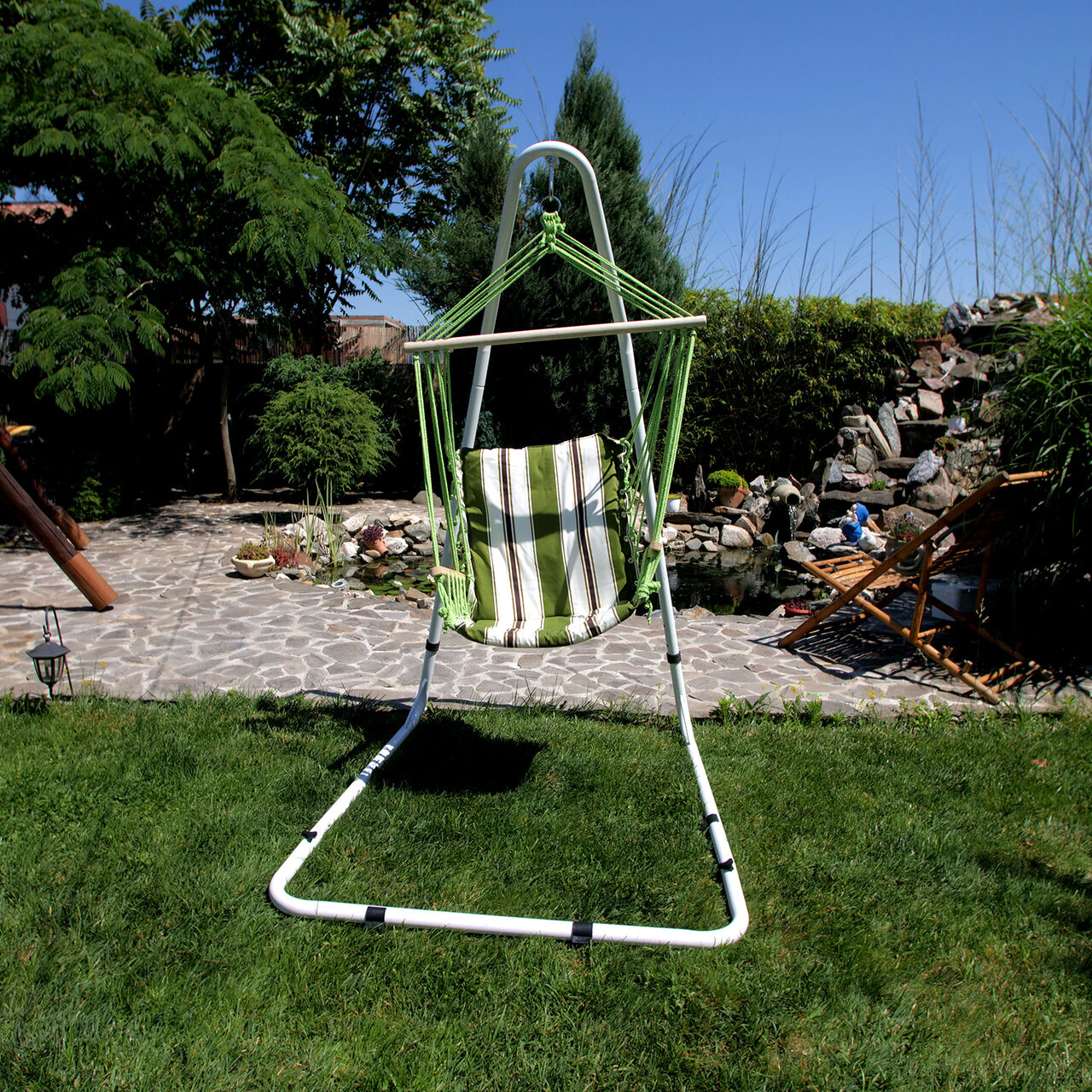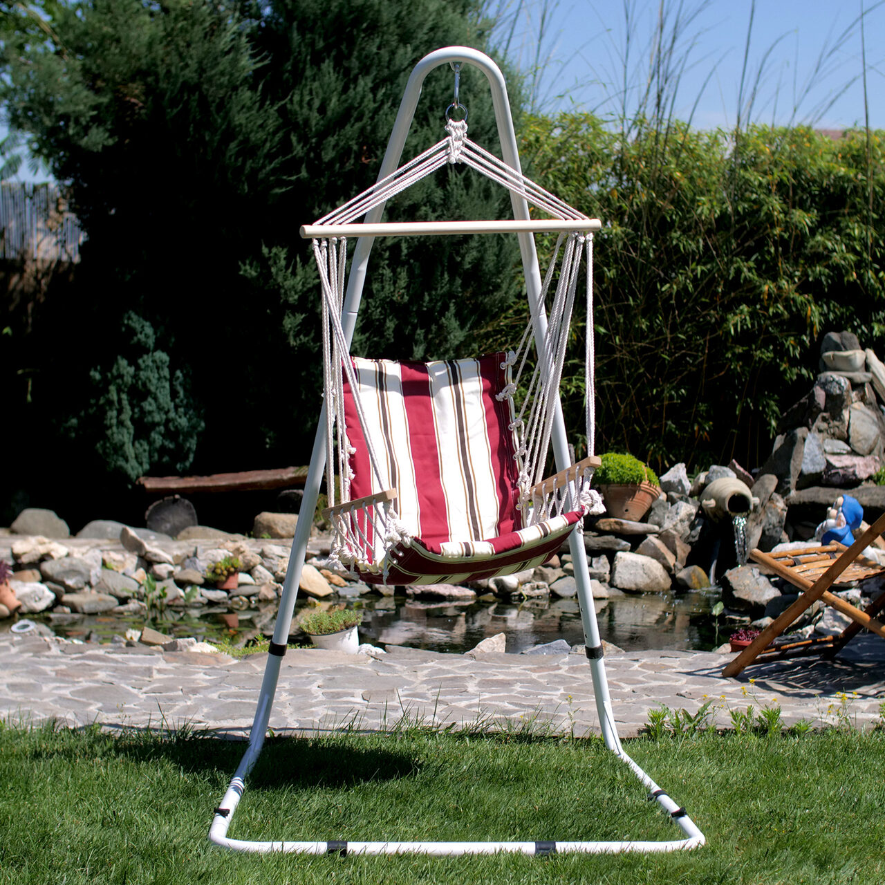 - Suportul pentru hamac este ideal pentru suspendarea hamacelor tip scaun pe terase, grădini, sau în alte spaţii în care nu aveţi de ce anume să îl prindeţi. Materialul din otel, fiind rezistent în timp, este uşor de montat, iar datorită suportului hamacul poate fi uşor de mutat în orice spaţiu. Greutatea maximă suportabilă este de 200 kg.