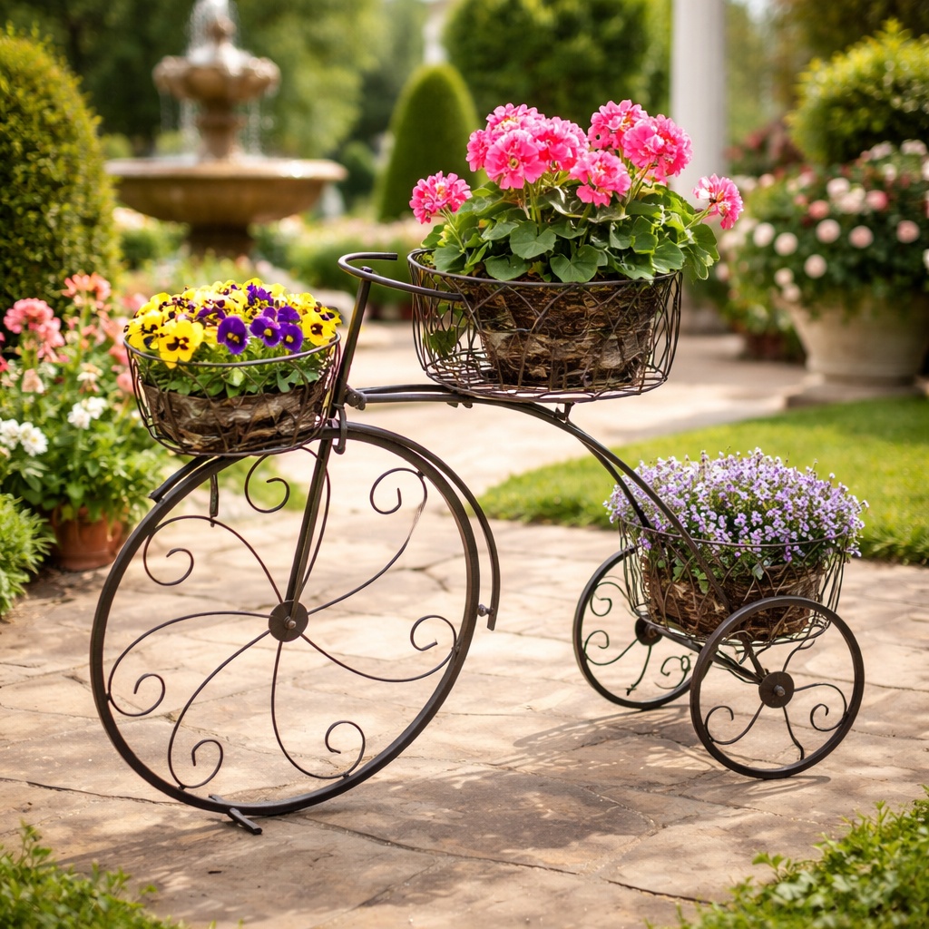 Adauga un farmec boem si retro gradinii, terasei sau balconului tau cu suportul metalic in forma de bicicleta de la Strend Pro. Acest element decorativ nu este doar un suport pentru plante, ci o piesa de arta rustica ce pune in valoare florile tale preferate intr-un mod creativ si elegant. Designul compact cu 3 cosuri permite crearea unui mini-aranjament floral pe mai multe niveluri.
