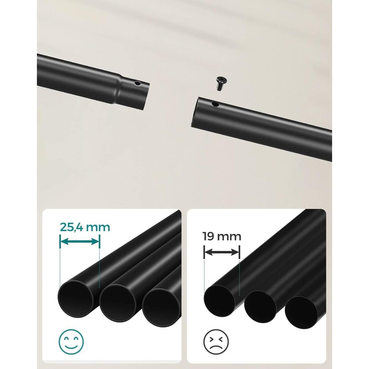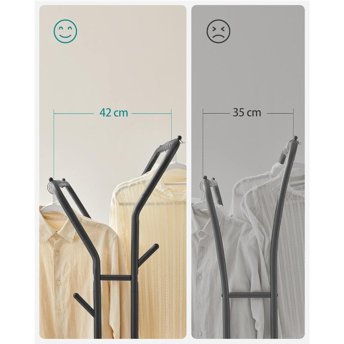 - Suportul are 2 bari foarte stabile si rezistente care sunt folosite pentru a depozita paltoane, jachete, rochii, camasi si jachete pe umerase. In plus, putem agata si saluri, esarfe sau fulare.