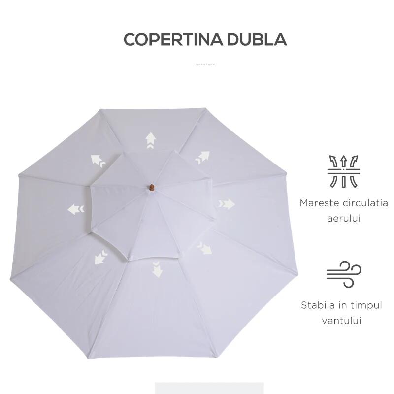 Umbrela gradina/terasa, acoperis dublu pentru ventilatie, stalp lemn, alb, 265 cm