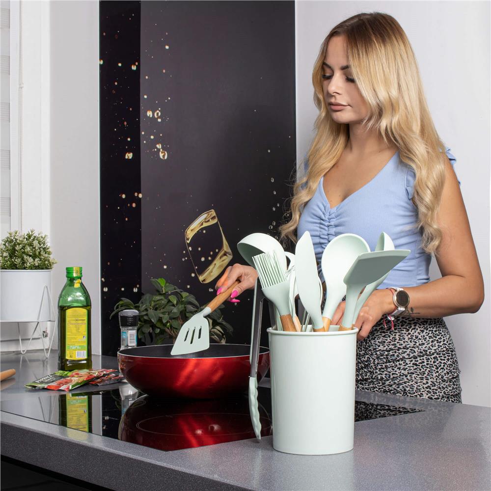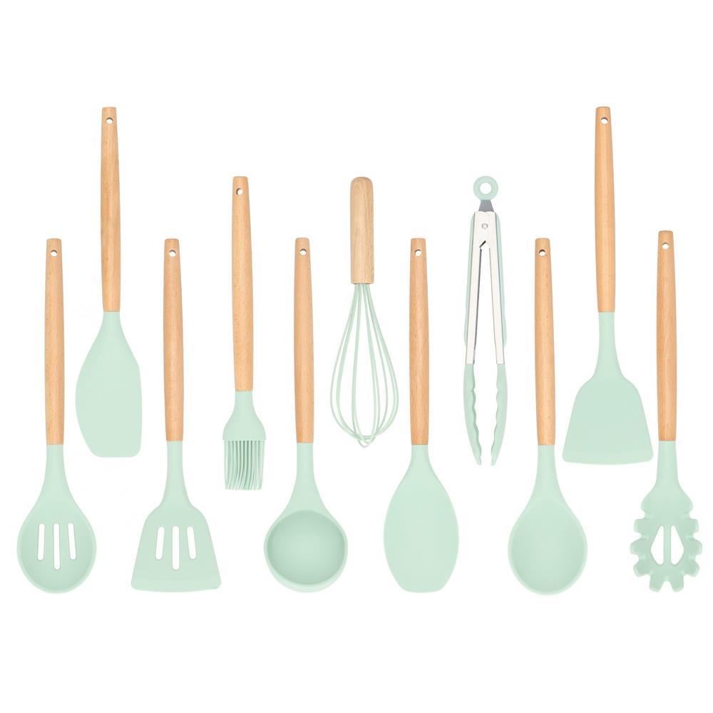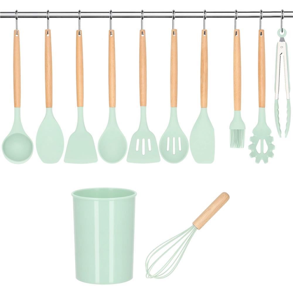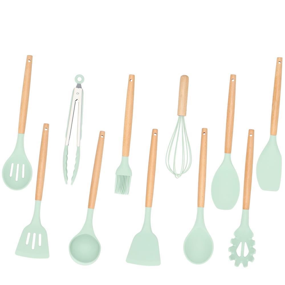 Ustensile bucatarie, silicon si bambus, menta, set 12 piese, Springos