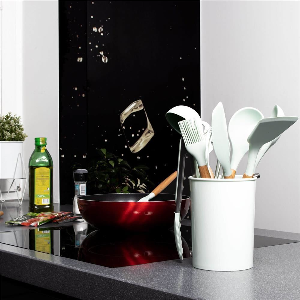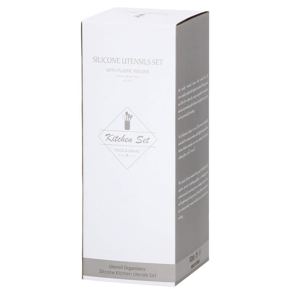 - Siliconul este usor de curatat, chiar si reziduurile de produse uscate. Recipientul pentru ustensile, care face parte din set, are o deschidere in partea de jos, datorita careia veti mentine ustensilele igienice si fara umezeala. Daca folositi sine suspendate in bucatarie - ustensilele au gauri care va permit sa le atarnati.
