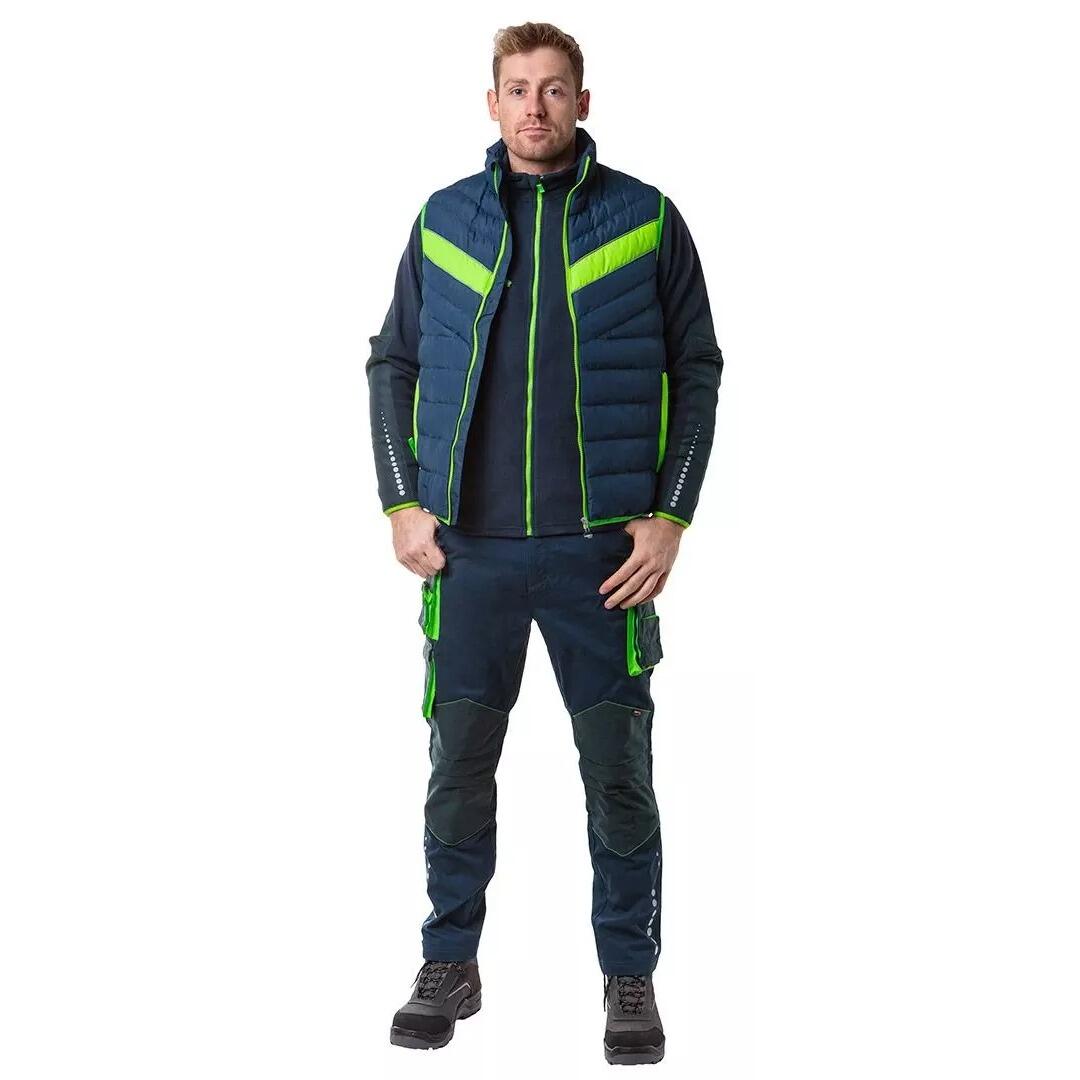 Vesta de lucru matlasata PREMIUM de la NEO are o combinatie moderna de albastru marin cu accente verzi.